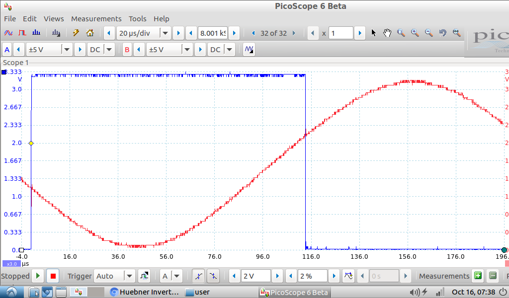 I did some measurements on pin PA7 with a 3.3V supply and a potentiometer feeding via a 10k/1nF 16kHz break off frequency filter. Then with 330r/1nF filter 482kHz break off frequency. And finaly with a 330r/30nF 16kHz break off frequency filter. Also another interesting finding. When having the oscilloscope probe at PA7 (sin) this is what angle plot looks like. And this is when the probe is at PA0. A hole lot more jitter when probeing at PA0, which is odd. Something is happening with this pin. However on the blue pill PA0 is also the throttle pot input which might mess it up a bit. I will pull my real board out of the inverter tomorrow to take better measurements.