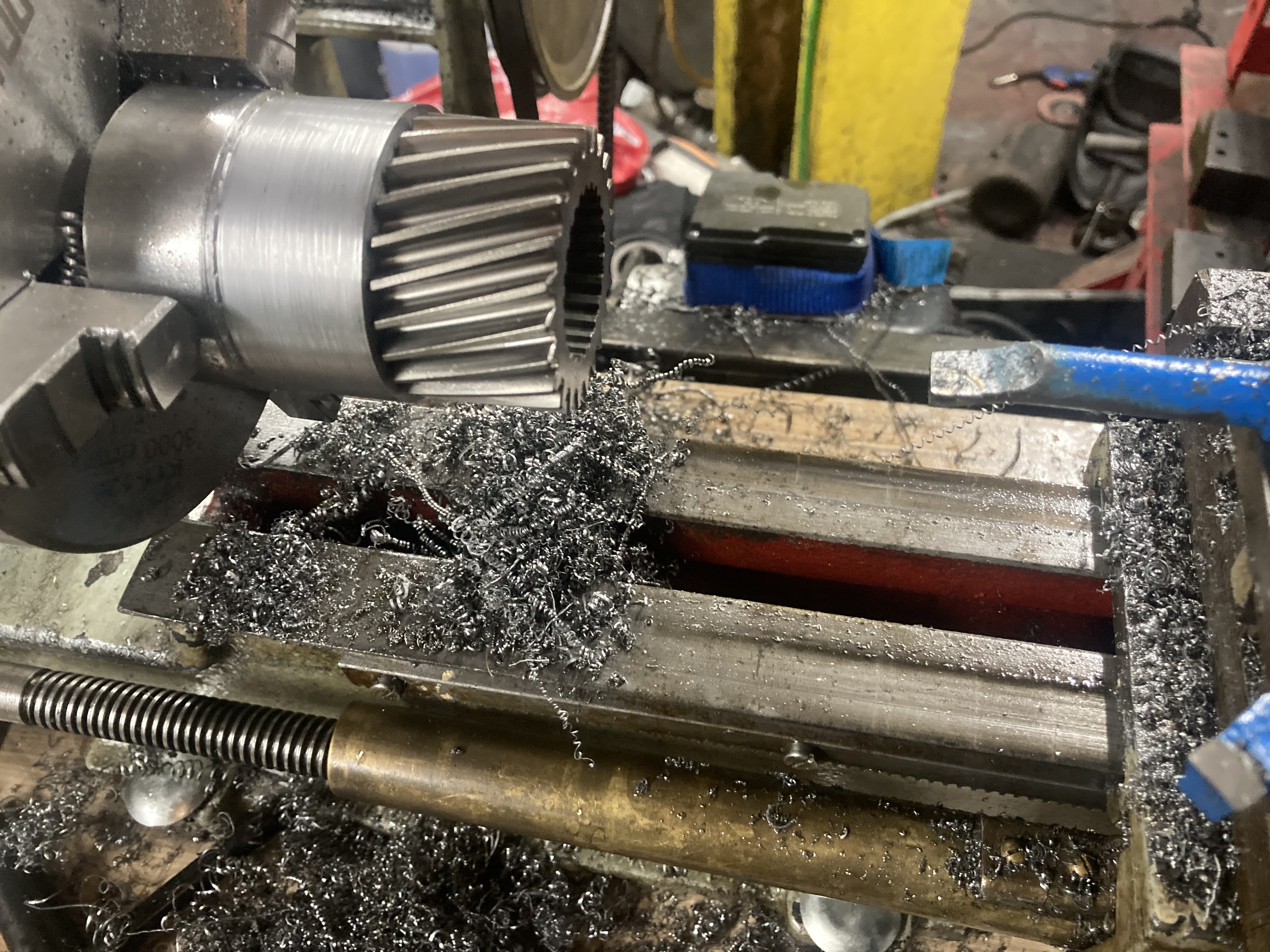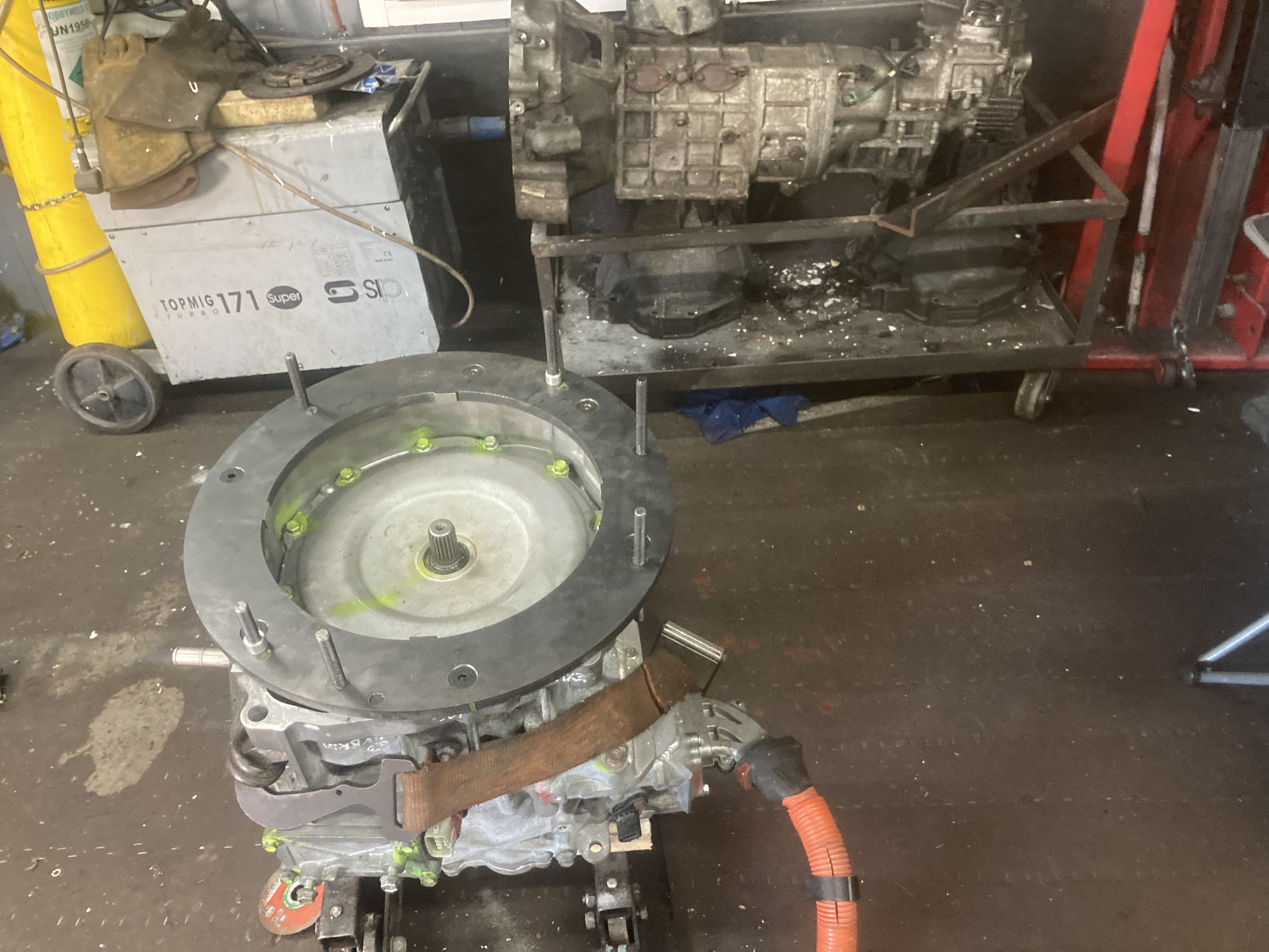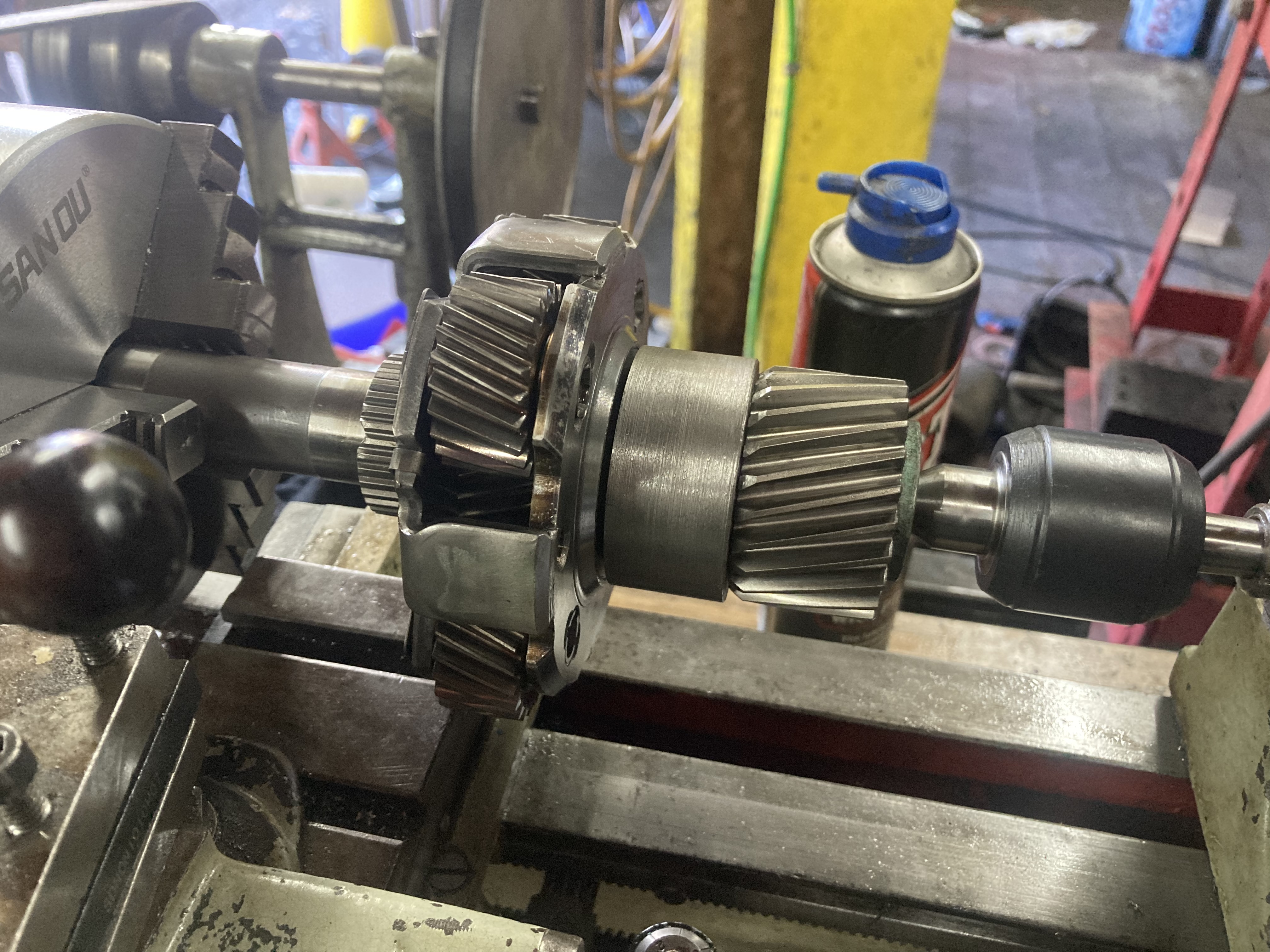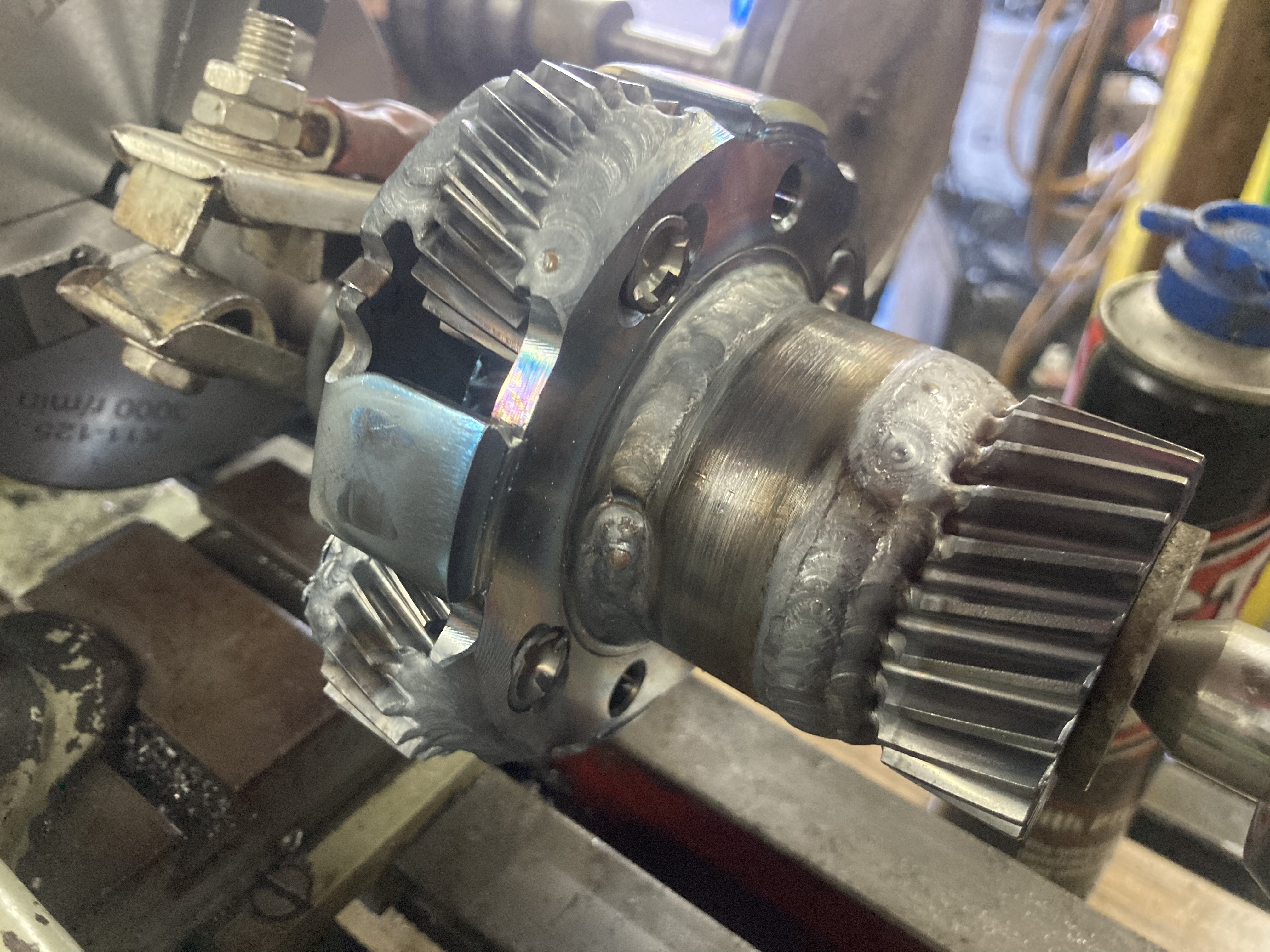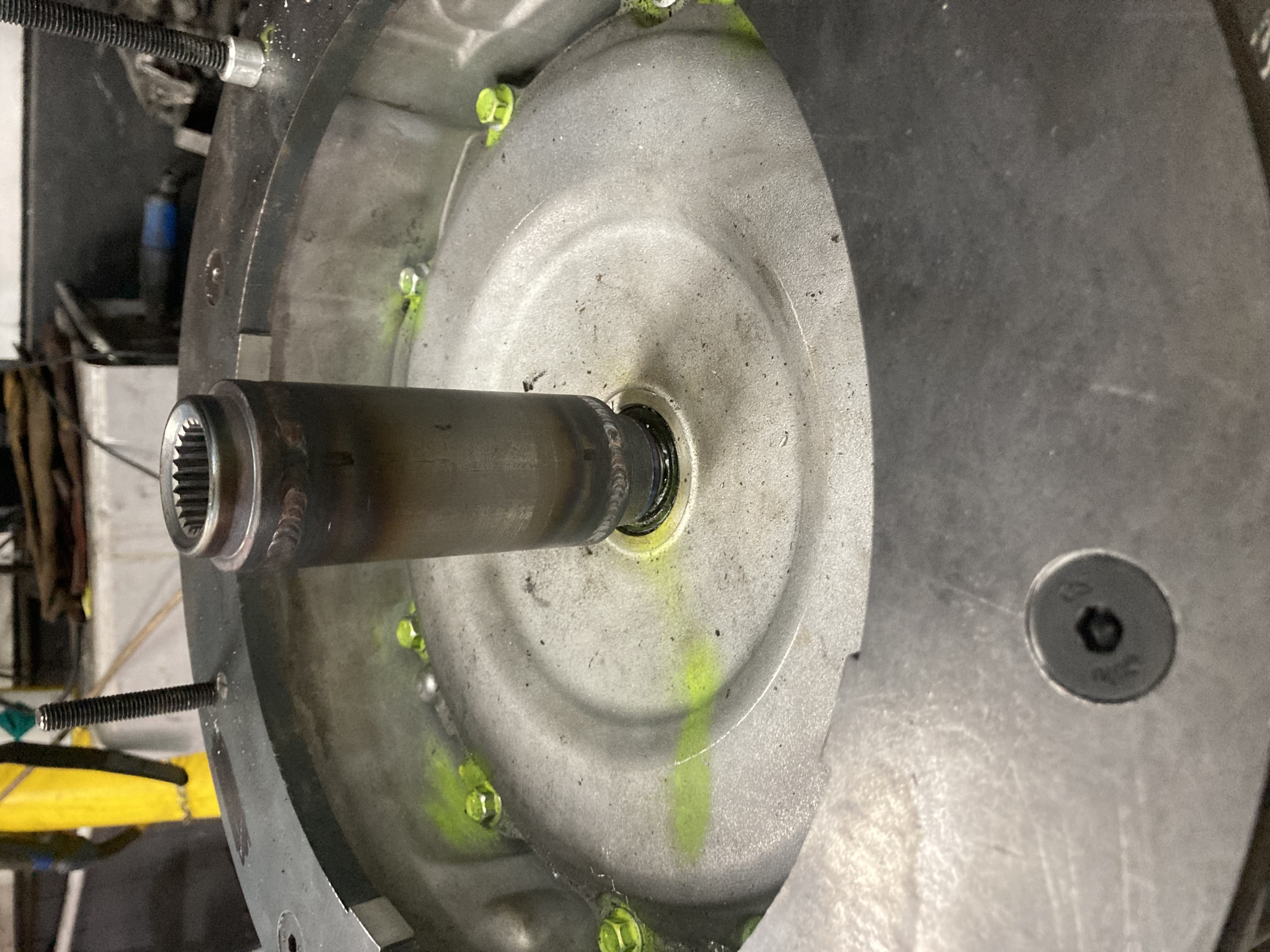 Frankenmotor update time, I have finish all modifications to the cases, sealed the internal welds with epoxy as there where some pinholes and I don’t want oil leaks, cleaned and rebuilt with mg1 and mg2, gutted the oil pump and modified the pump housing to provide pickup and feed locations for an electric oil pump (soon to be repurposed power steering pump) machines up a coupling piece from steel to join various parts from the 2 planetary gear sets to make a coupling between mg1 and mg2 and lock the input shaft to become an output, cleaned all the parts and held in place in the lathe ready to weld, attached my drill to the lathe motor pulley and set everything in low gear so it was slow enough to weld,.. welded everything up now I’m just waiting for things to cool down to se if we have a successful part