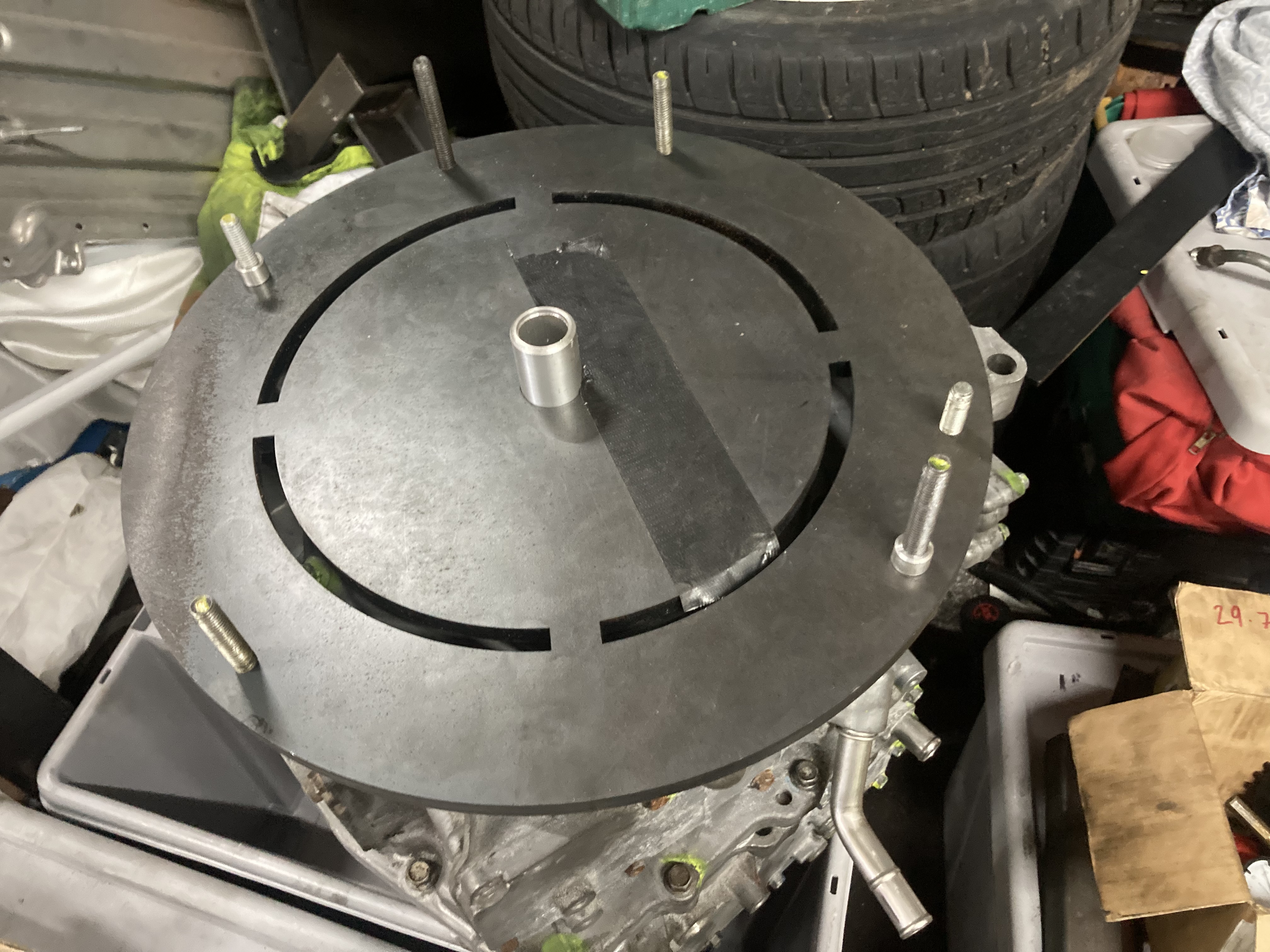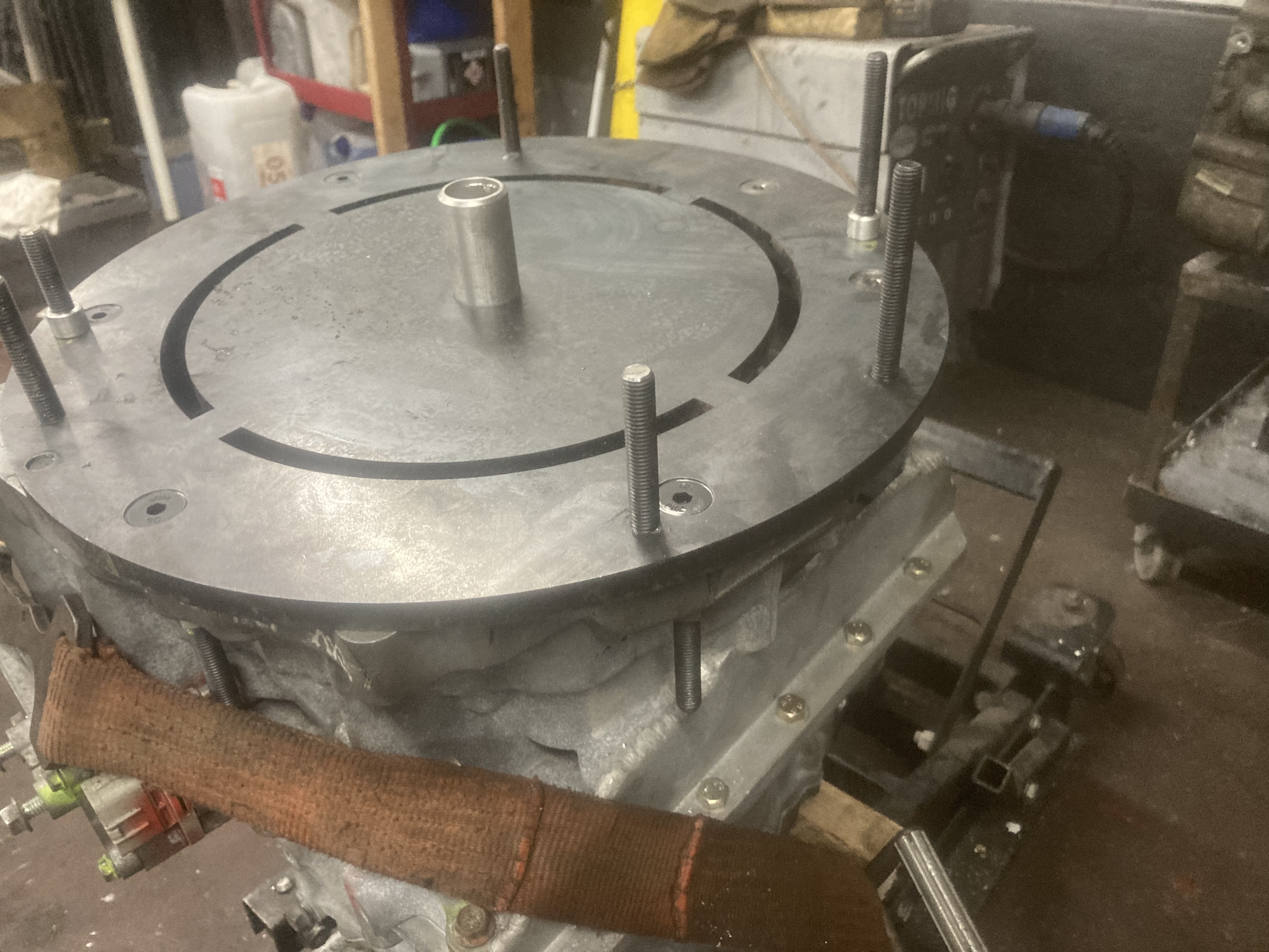 I had this plate cut some months ago to match the gearbox, but with A lack of any accurate way the measure the location of the motor bolt holes I designed in a center section which will be cut out afterwards, and turned up an aluminium sleeve that fits on the motor output shaft to locate the plate centrally, holes will be then marked with transfer pins screwed into the threaded holes and transfer punches through the bolt holes. But now I’m out of the country diving for 3 weeks so next update will be a month or so!