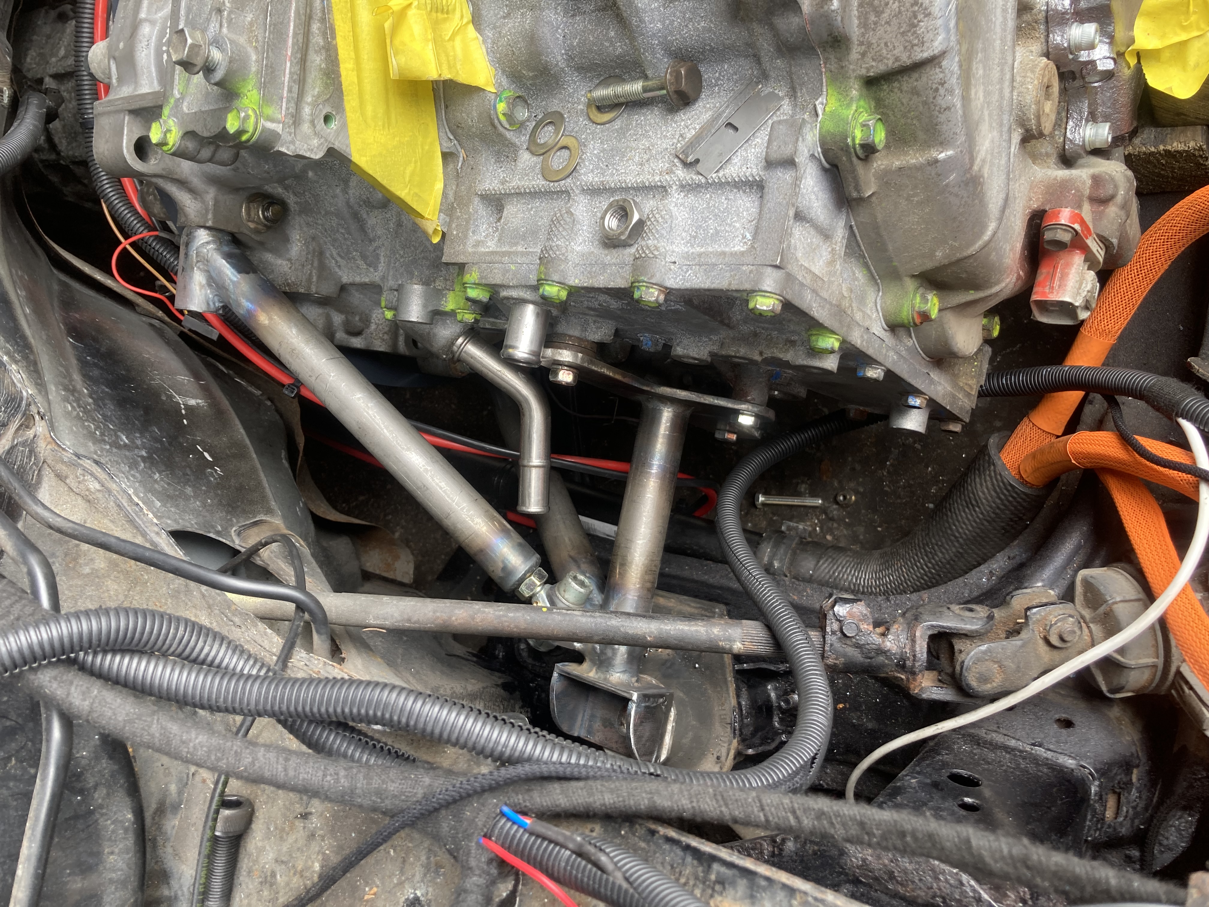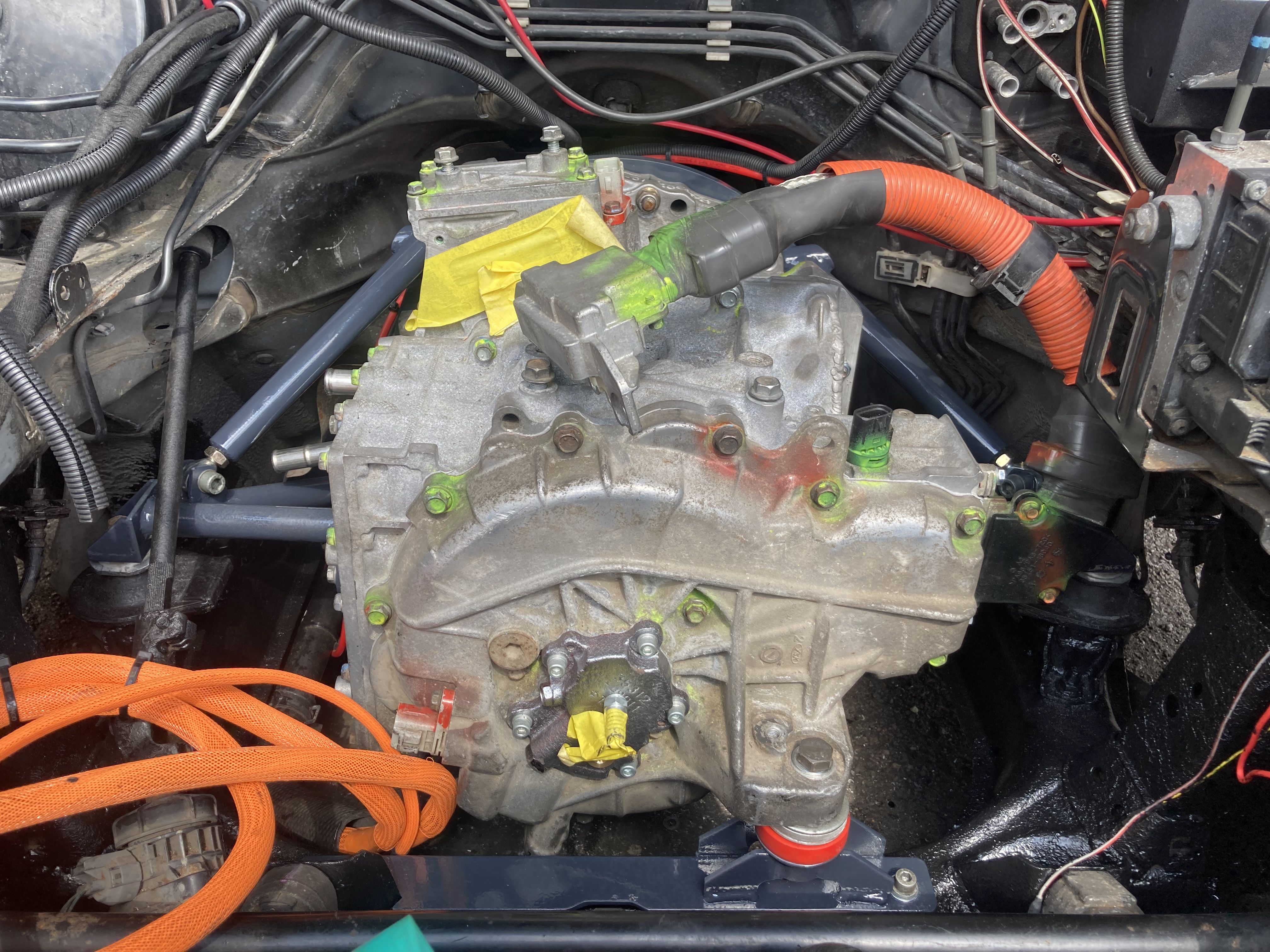 Motor mounts all finalised painted and fitted, I made up a front mount to pick up on the large lug on the end of the casing as it was one of the original transaxle mounting points, seemed rude not to use it, I ran out of argon so this mount is all mig welded together, I used a polyurethane bush I had laying around from something else,