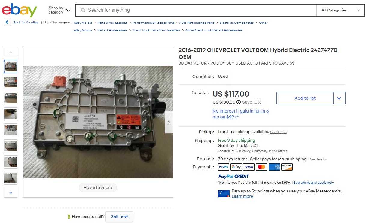 so I scored a Chevy Volt second gen DC-DC Converter, essentially for a $100 bucks, couldn't pass that up, and FREE shipping, I am sharing the eBay listing details because I know when I was a beginner (so many, many days ago, ha ha) I wanted to know what these used electric/hybrid car parts cost and more importantly what people are paying for them, folks please remember that sellers can ask what ever price they want for their items, it does not mean you have to pay it, or that the item is worth that, and every day more and more used OEM EV parts hit the resale market (thank you distracted texting soccer moms), also be aware of some sketch eBay practices where a seller will list multiple items at different prices, one being sky high to make the others look like good deals, there is a term for that, which escapes me at the moment, if you know what this shady practice is called please post a quick response, a while back one of those 20/20 magazine TV shows did a special on this