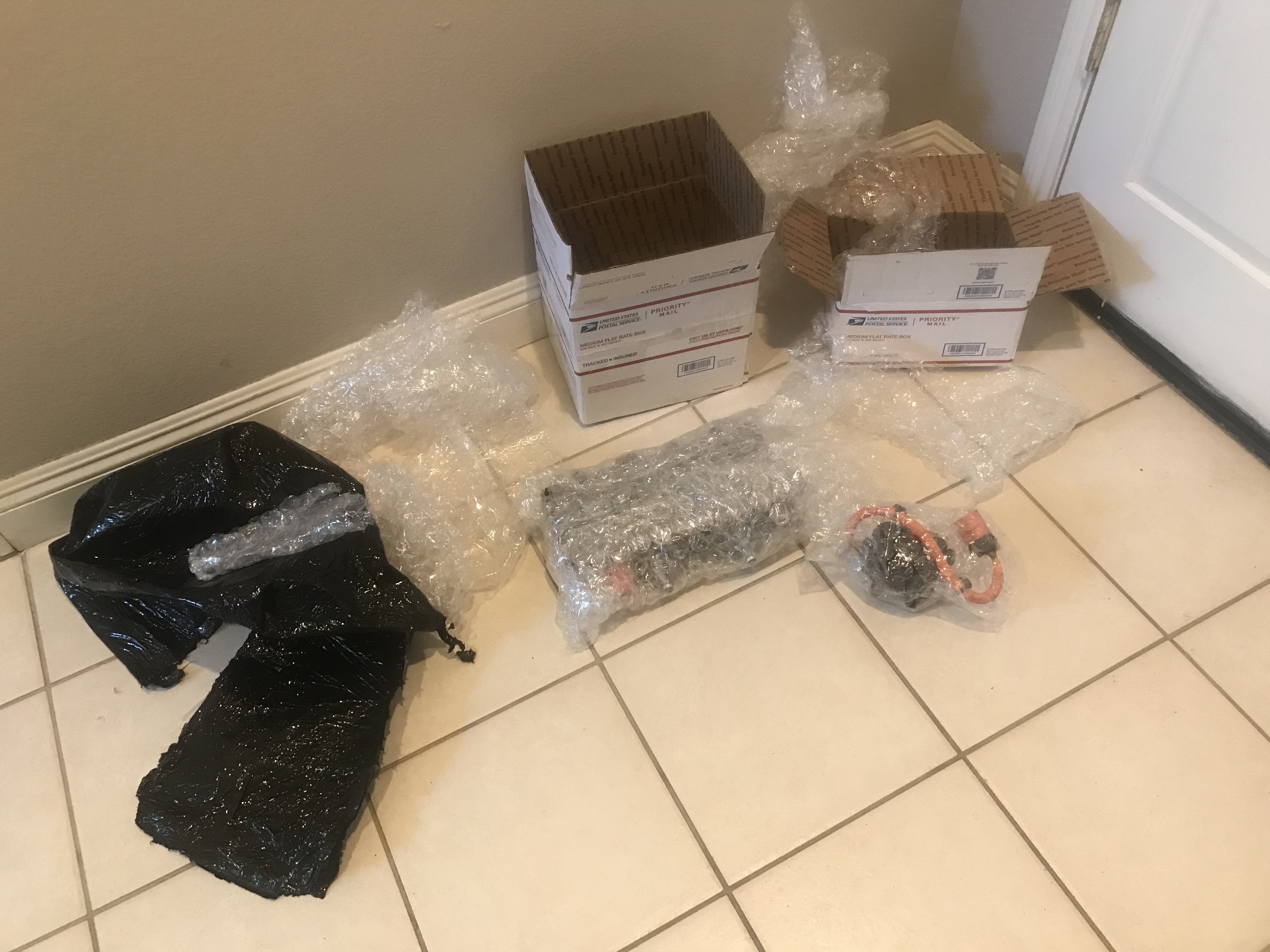 so let's lay them out in the driveway and take a look see (pretend you are standing at the rear of the car and looking into the trunk where the converter lives and then follow the metal tube thingie which runs under the car to the front of the vehicle where it plugs in to the front of the high voltage battery pack under the engine bay firewall)
