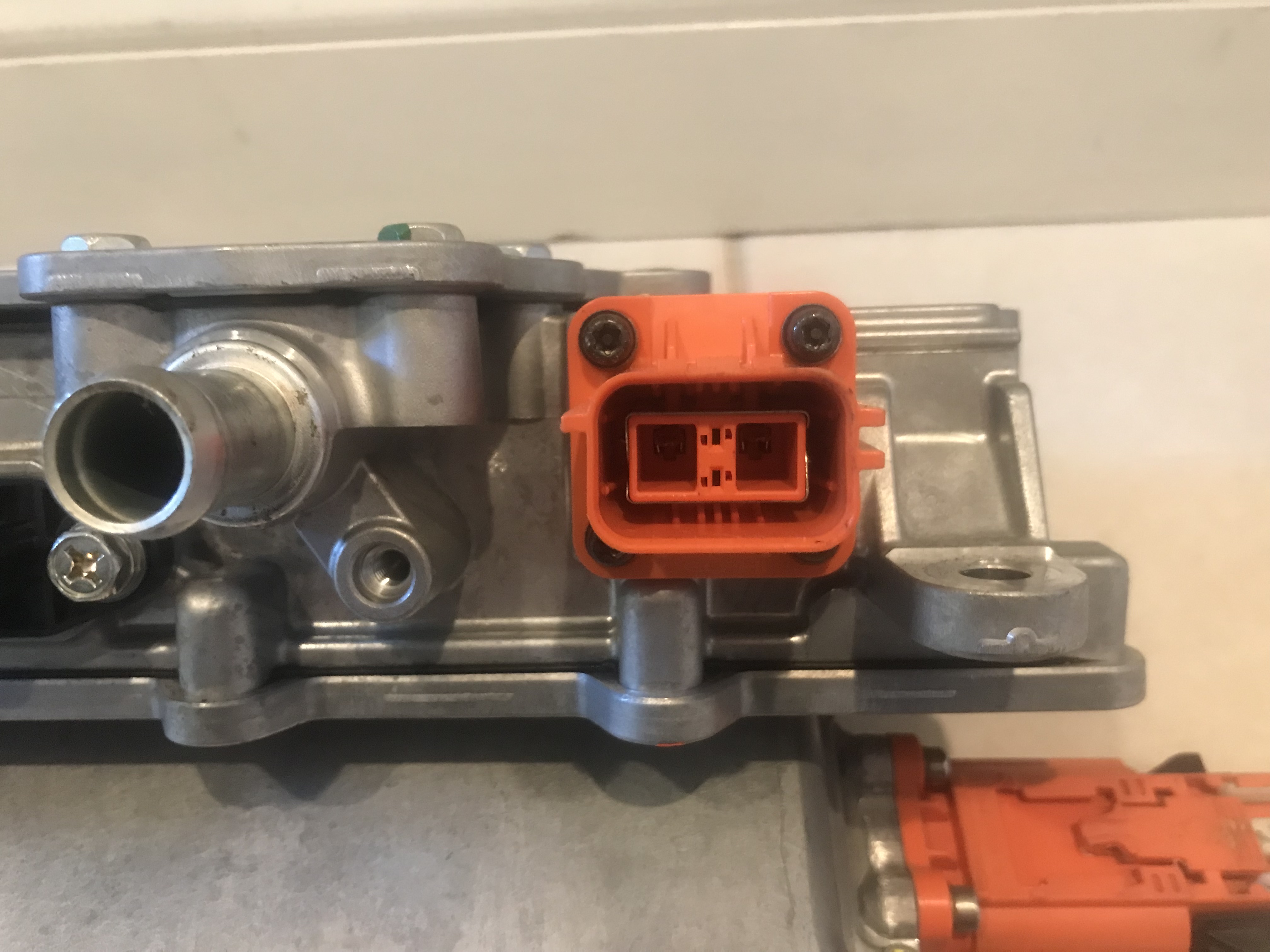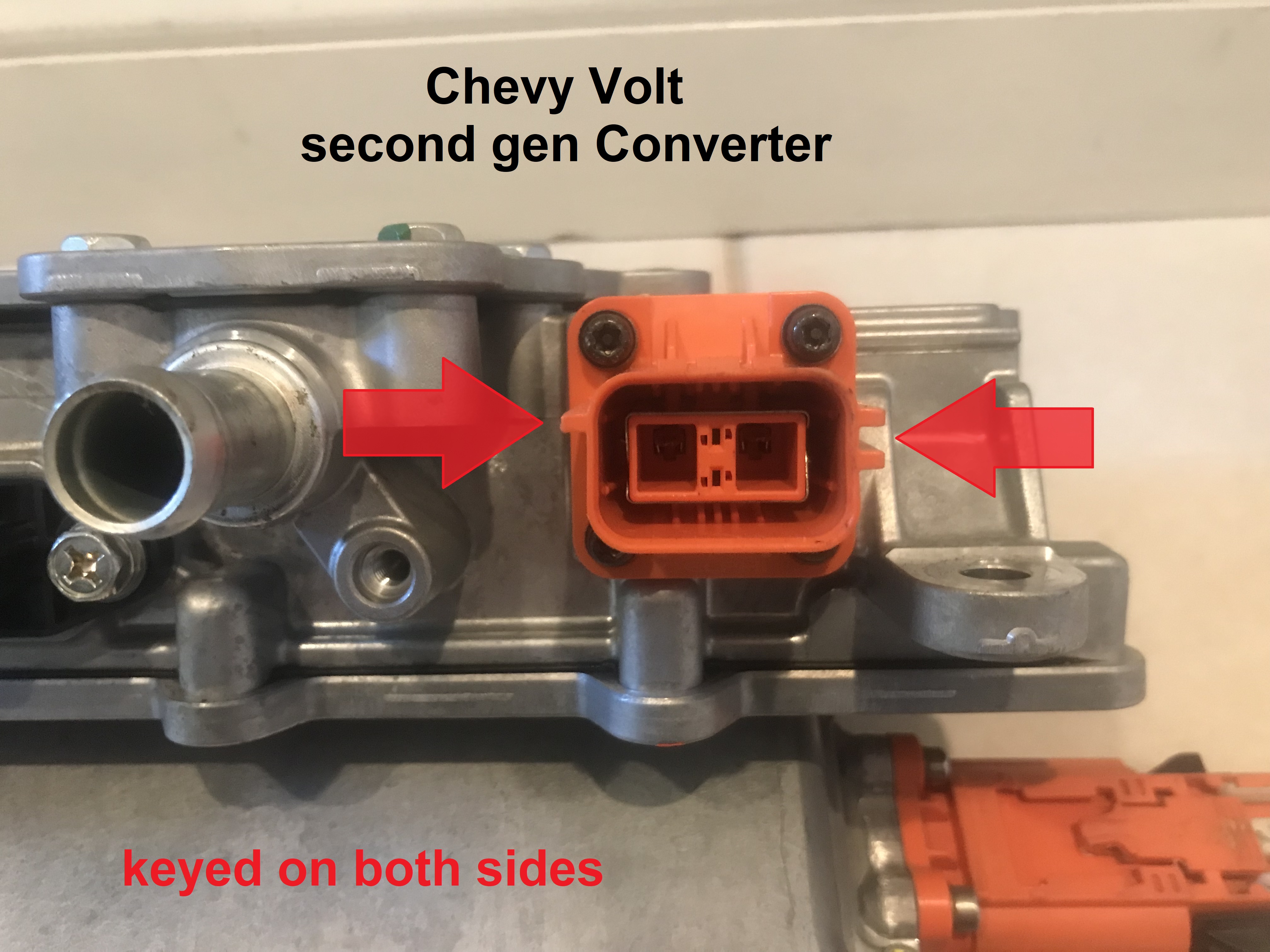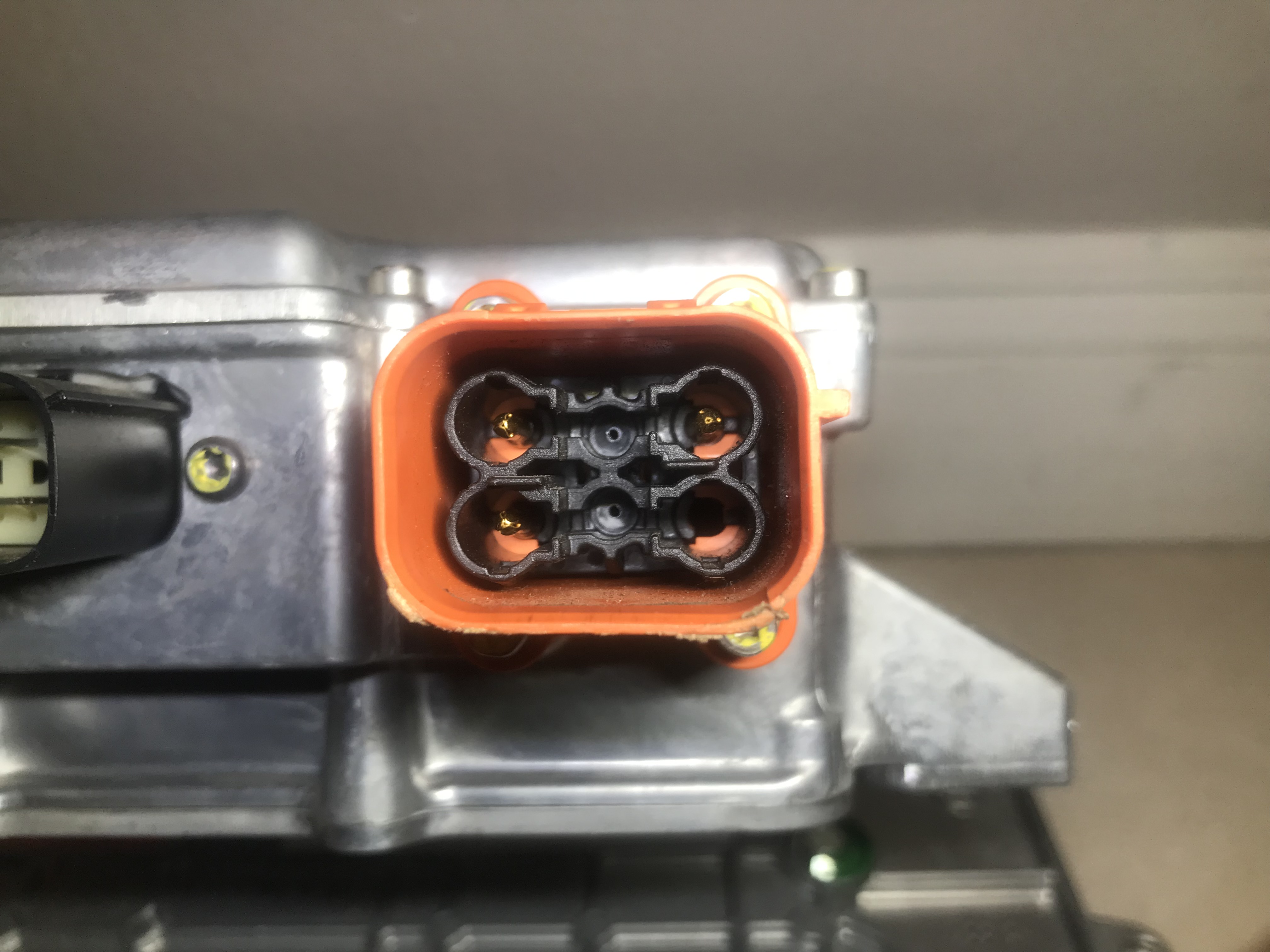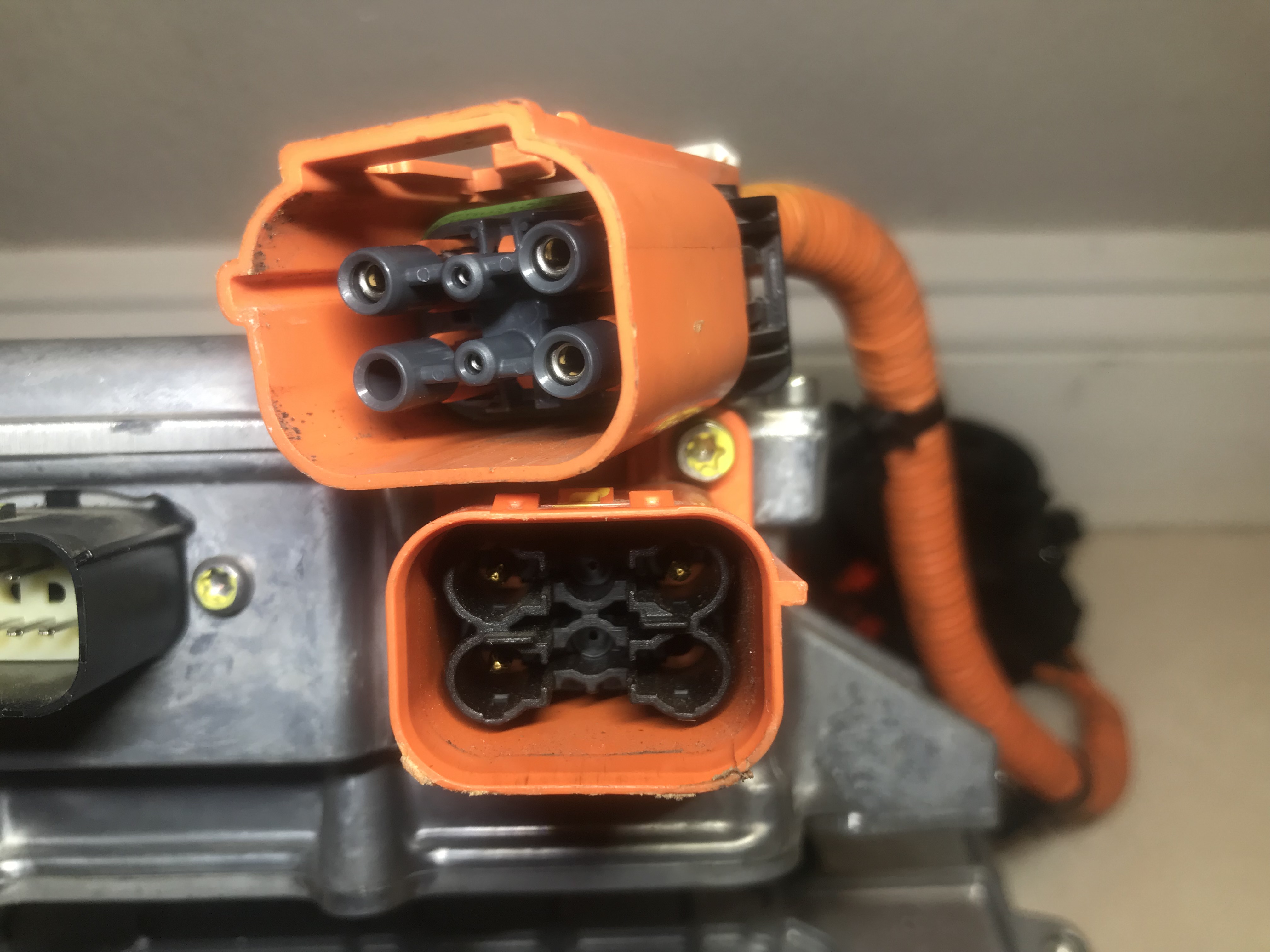 and just for giggles here is the comparison of the orange high voltage two nostril ports of the first and second gen onboard battery chargers
