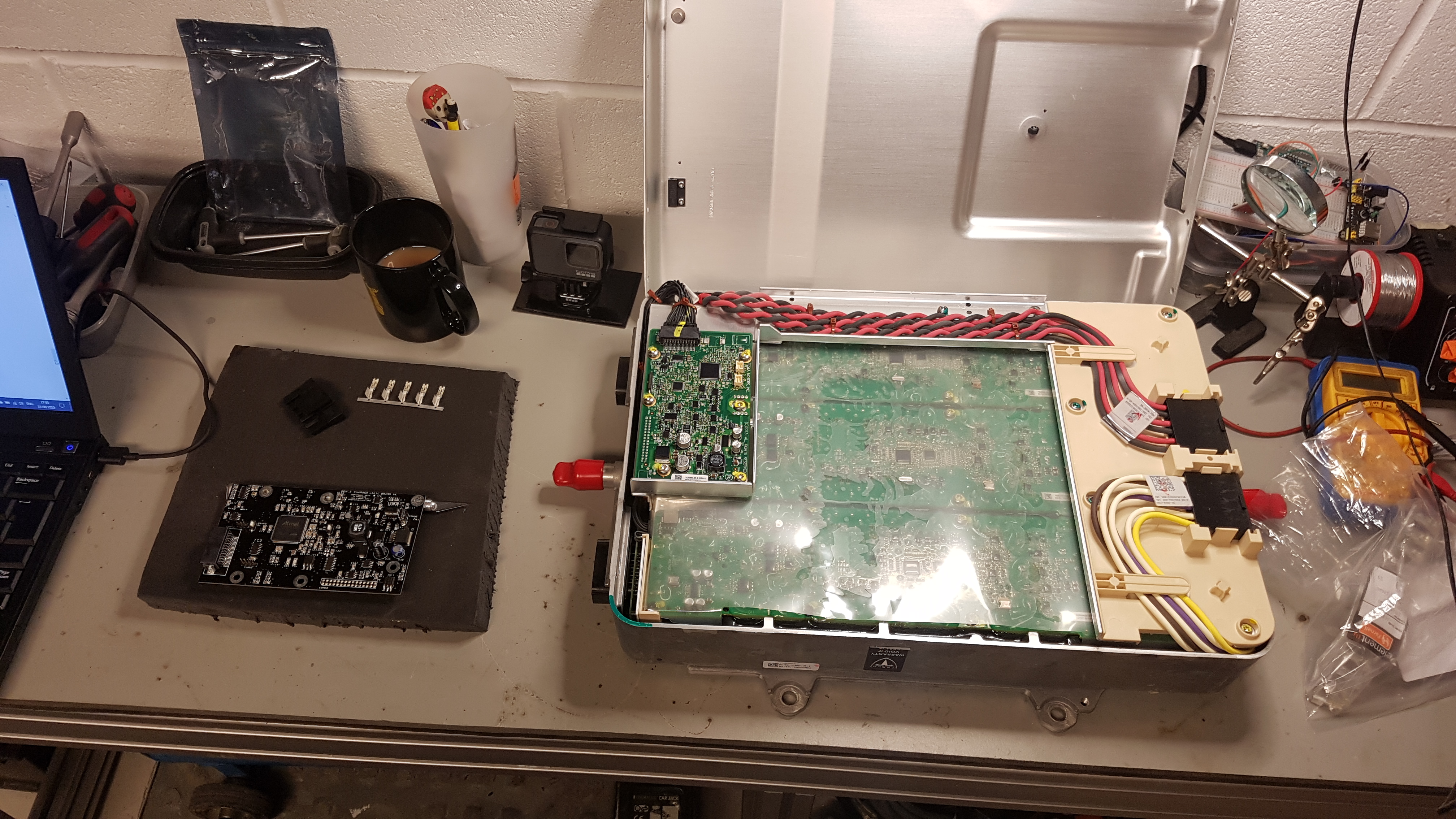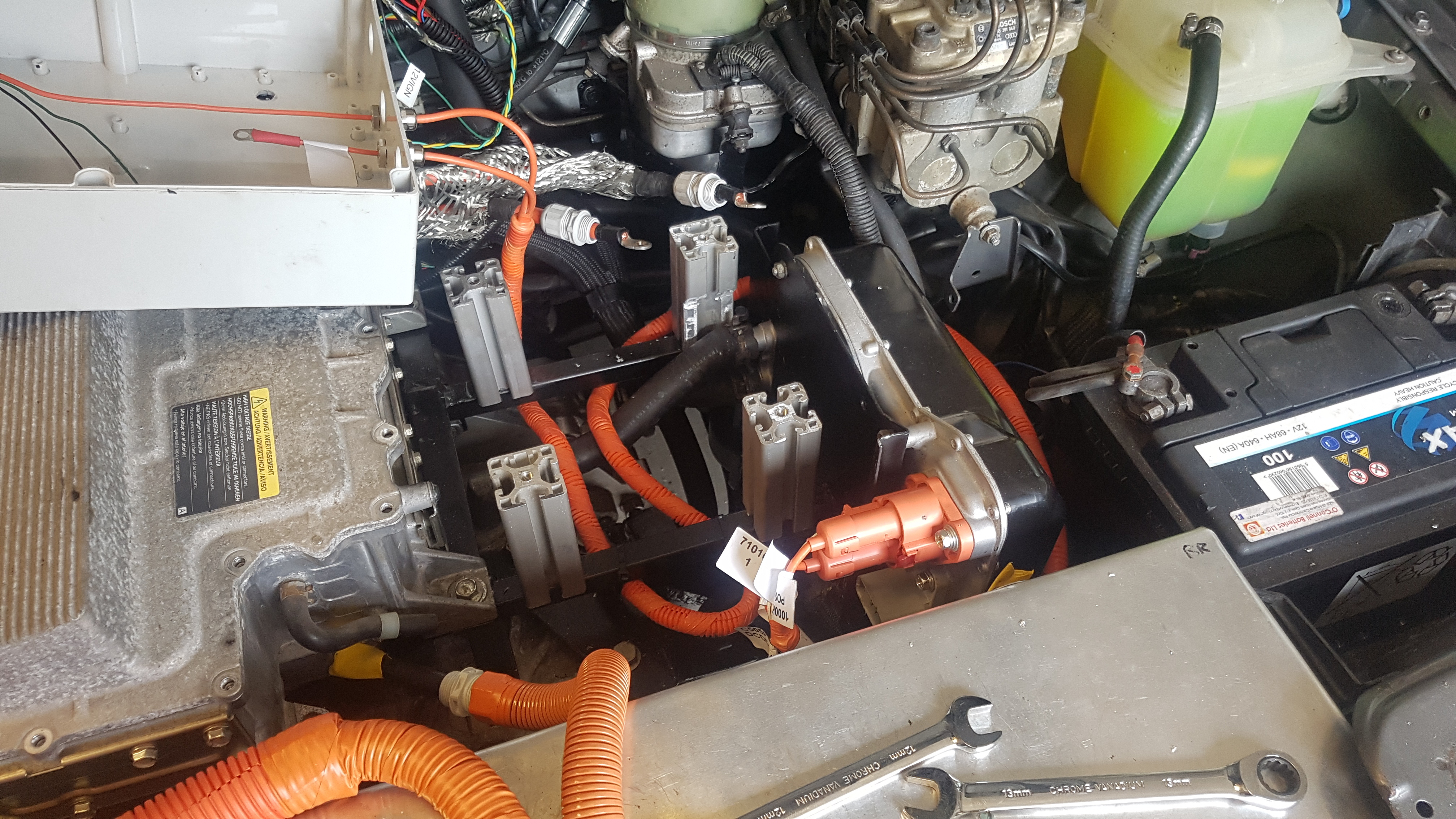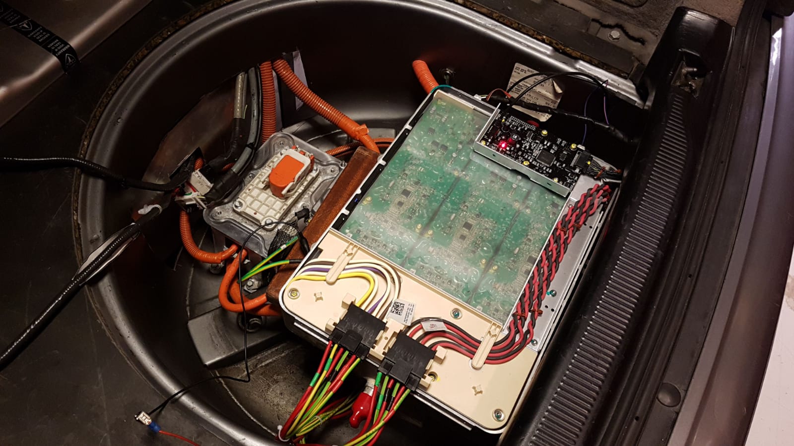 . Will swap them out once testing is over. As another temp solution till I get some more cash, the DC and AC 2mm HV interconnecting between the Gen 2 charger, hence the glorious mix of red and earth 2mm wires, all hooked up to the extememly handy Tesla HVJB to connect everything up. I found my solar PV DC cable crimper the perfect fit for the 171825-0100 connectors to fit the molex 44441-2006 housing.