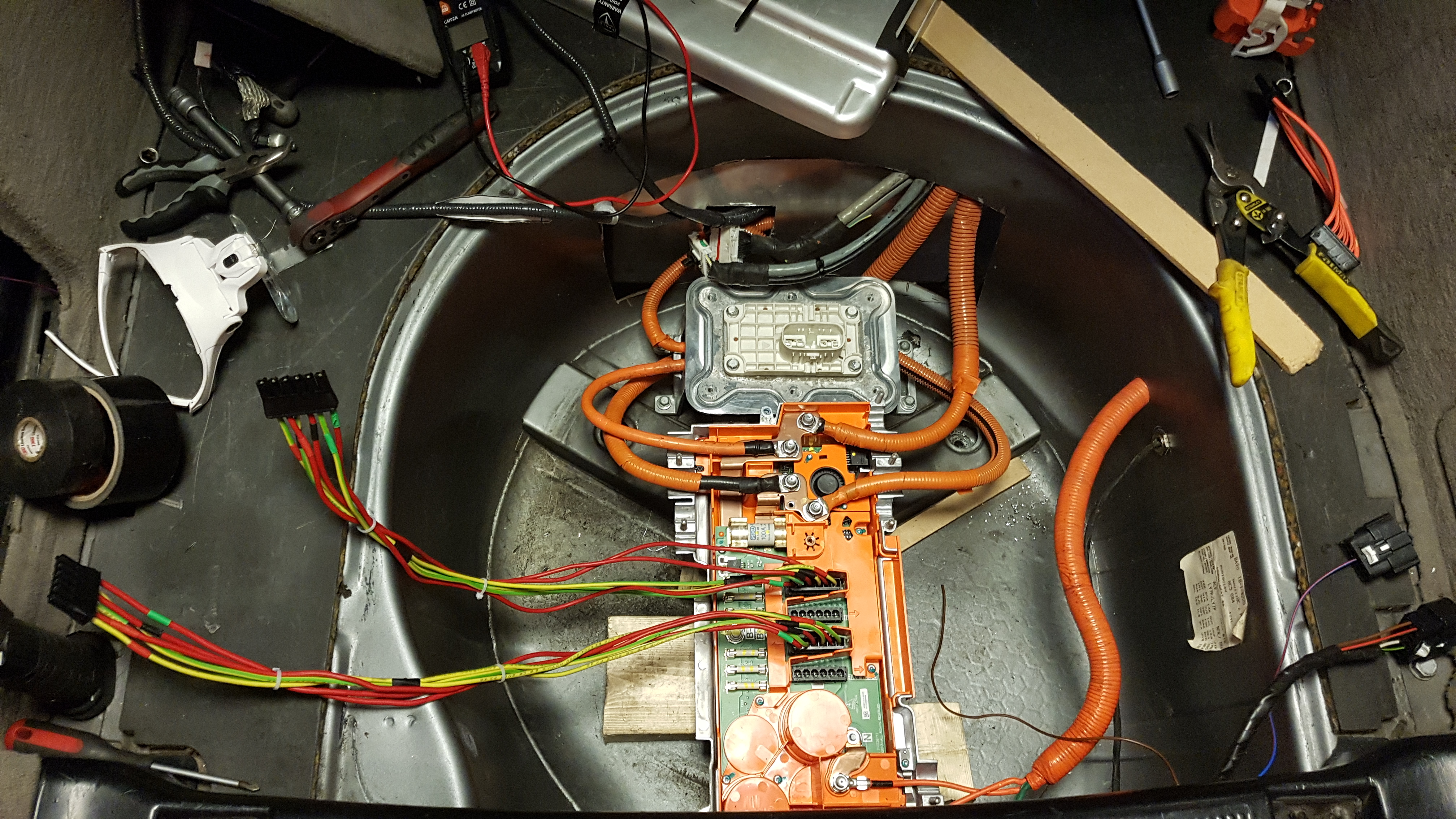 For now until I get the coolant loop added, I just had the AC current limit set to 5A. We'll ramp things up when we are sure I can keep the Gen 2 cool. Last thing to do now is patch up that gaping hole in the spare wheel well which I started last week, adding a few 25mm glands for the HV and securing the tesla HVJB and the charger so they don't go anywhere.