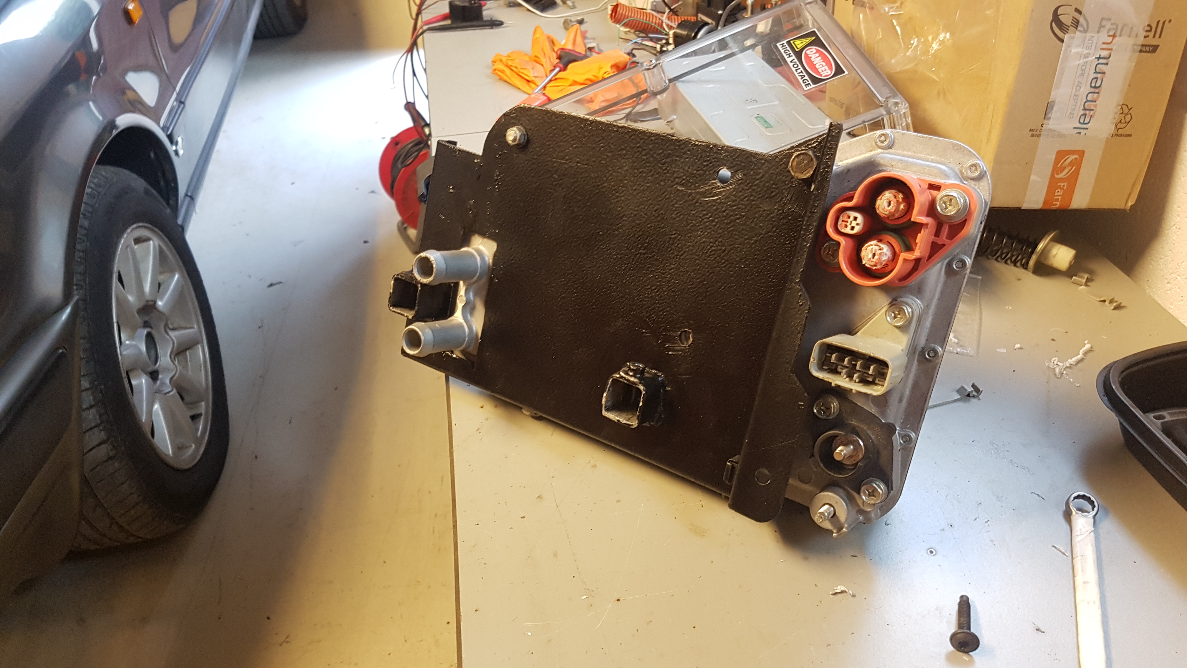 Next up, the too long forgotten DC/DC. I had been trying to get the old Leaf DC converter working but just didn't spend the time in getting a PWM signal knocked up for it. I was talking to kevin about it and he suggested the water cooled TDK DC/DC unit fitted to the Ford Transit Connect by Azure Dynamics and other hybrids in the ford range. Lars then graciously sent me on the control pinout on how to get it running. Pretty robust and simple unit really and I'll go into more detail on it in the next update when I get it fitted.