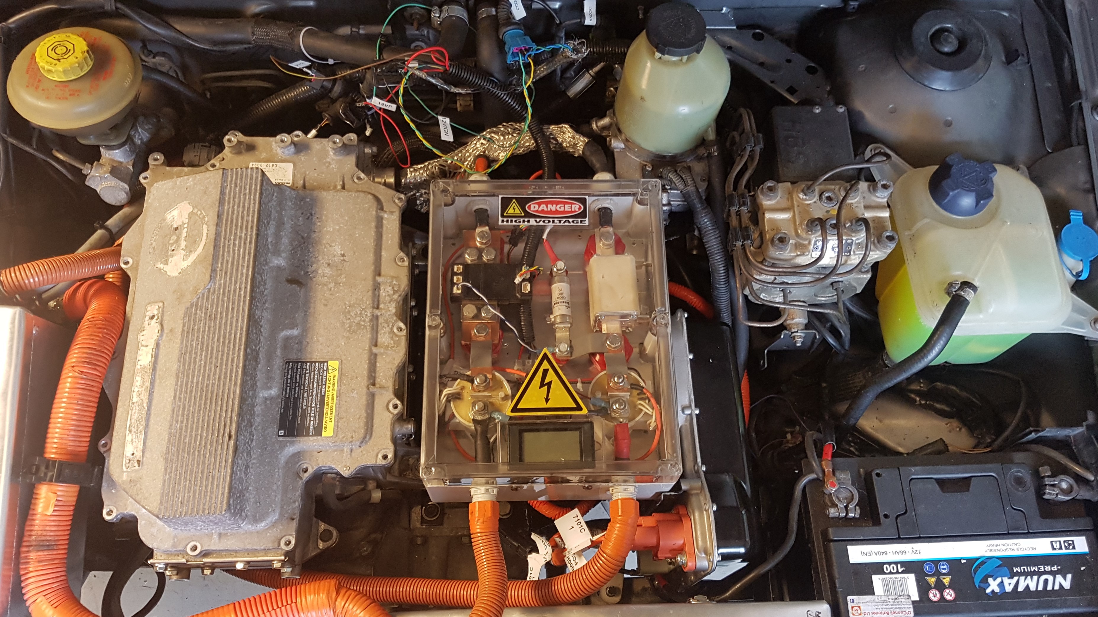 I have a few on the way so, if anyone needs one, let me know. Back to the fitting of the unit, after a lot of placing it here and there, I decided on mounting it to the HVJB frame box section. I fabb'd up a mounting plate from some old electrical box and welded on 2 x box section next size up as they sleeved perfectly together and makes it easy to unbolt and remove if needs be. Welded on some bolts to allow for good securing points. After some adjustments, its a nice fit. As a consequence of its location however, I had to raise the HVJB by 100mm to ensure the + HV cable would not be blocked by the DC/DC HV input. All fitted and wired up and the coolant system amended - it now goes from Inverter to DC/DC to motor. Not sure if this is good/bad but, we'll keep an eye on the temps as we go. I dont expect anything to get relly that hot as I have the loop going via the heater matrix also. Really happy with the finished result.