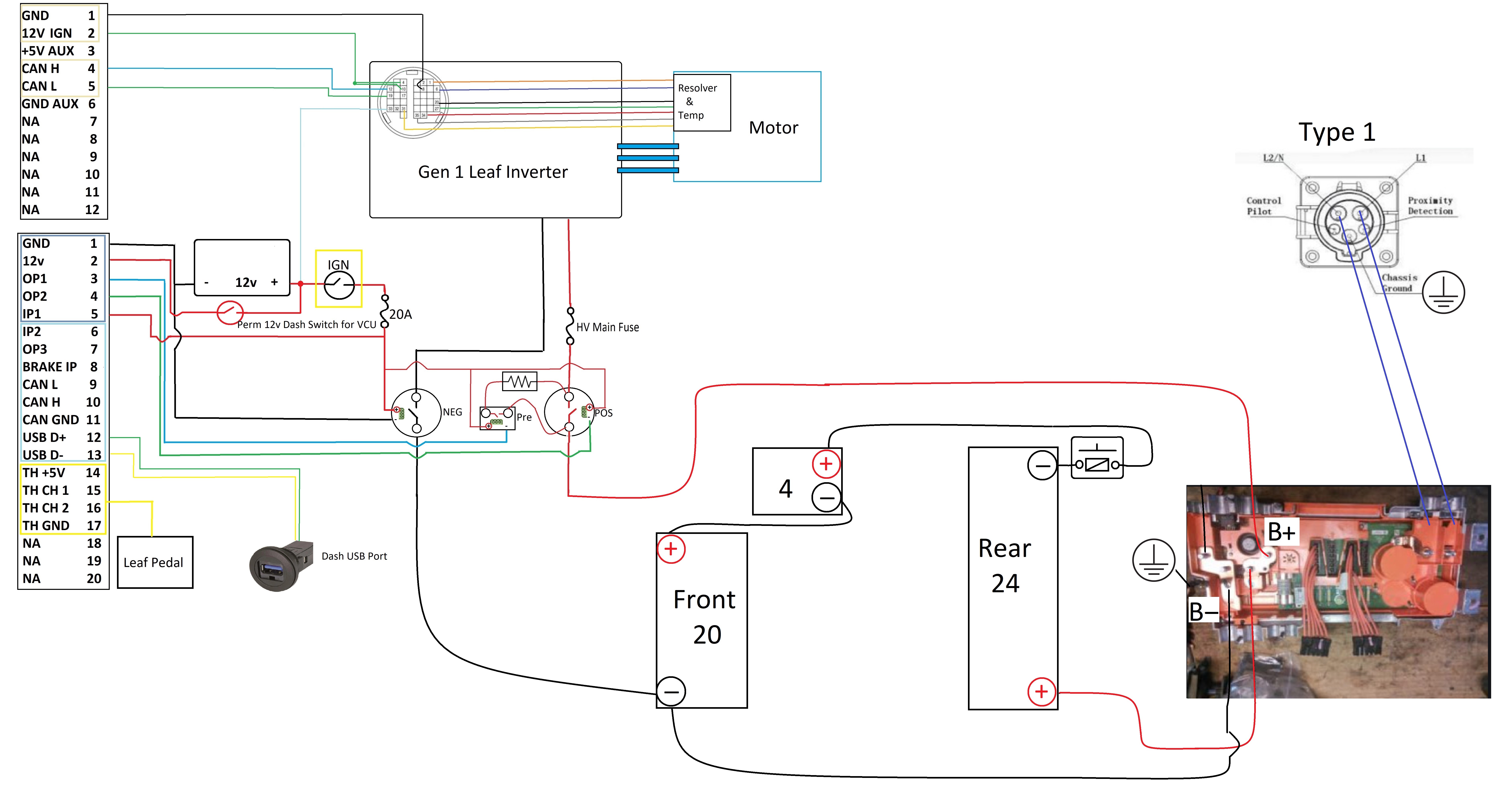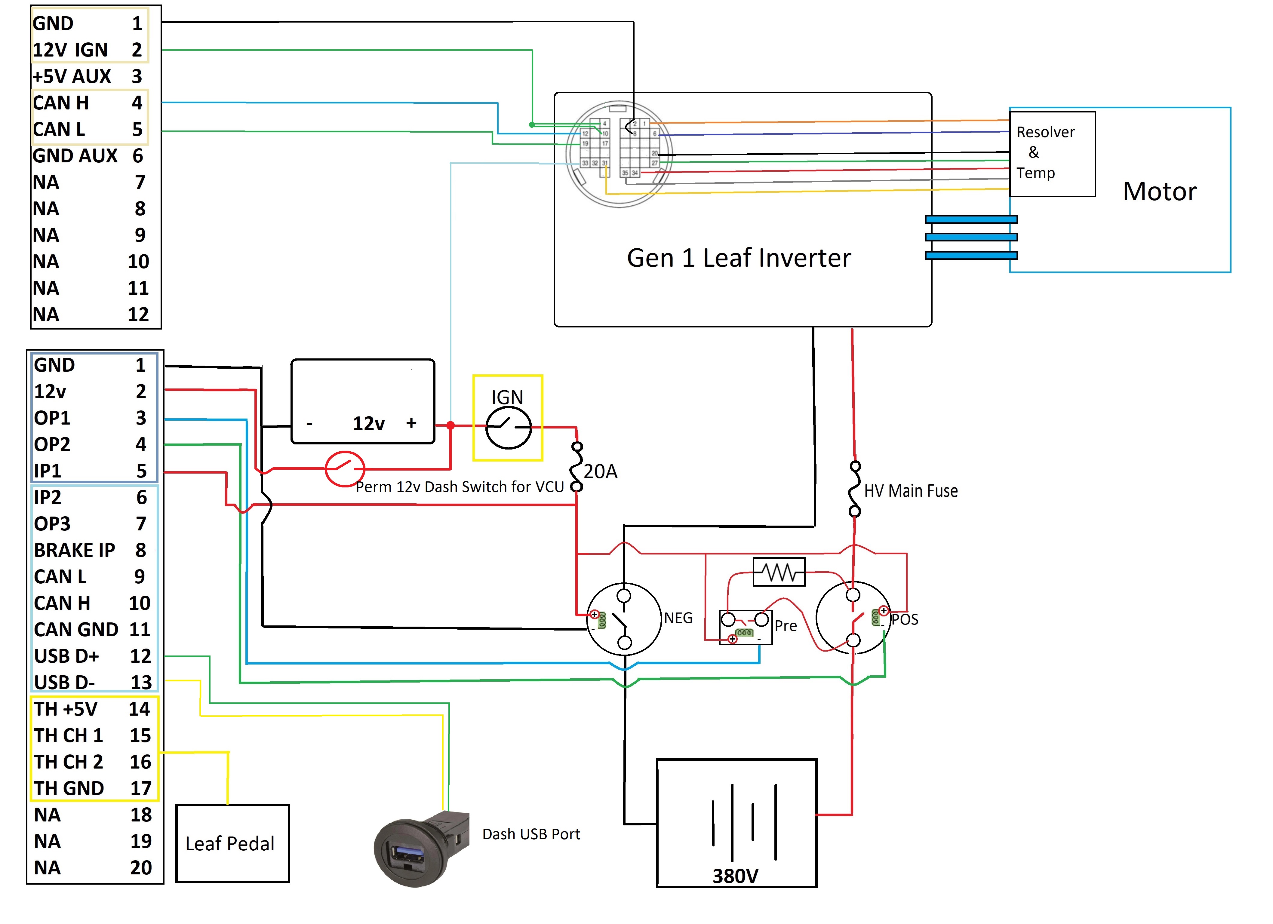 Stupid question time... It's about control of Pin 1 enable. How would you do it? I'm using Damien's Leaf VCU in the configuration below bearing in mind that precharge remains on after the main contactor closes. I tried tieing Pin 1 to the ground of precharge and obviously, nothing happened. I feel I might be about to facepalm when someone comes back with an obvious answer... I'm just tired