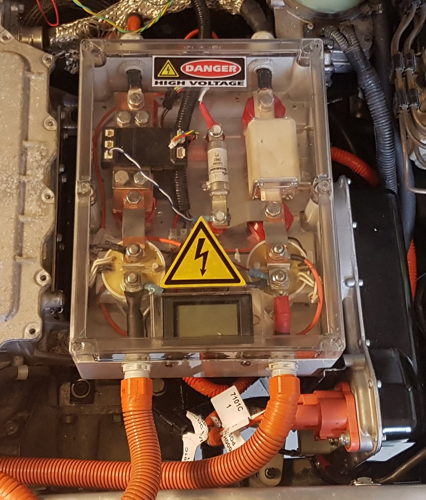 I have an 80A HV aux fuse after the contactor. You can see it here on the left of the main HV fuse. What I don't get is, I had a temporary setup kind of like you have, enabling the DCDC first but found the precharge session never completed and main closing, hence, I thought the DCDC was just taking all the juice and the time set in the firmware was elapsing between precharge and main so Main was never triggered. How are you triggering the enable for the DCDC before precharge? Is it built into the code?