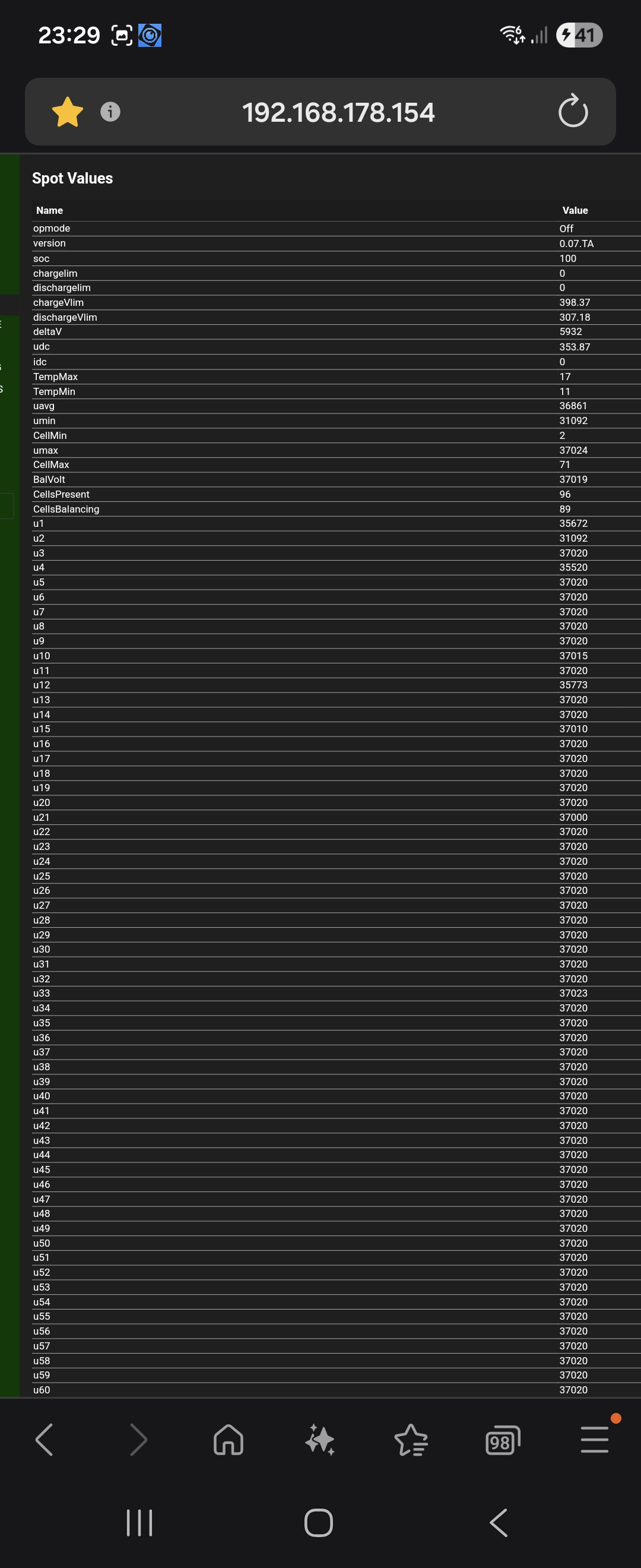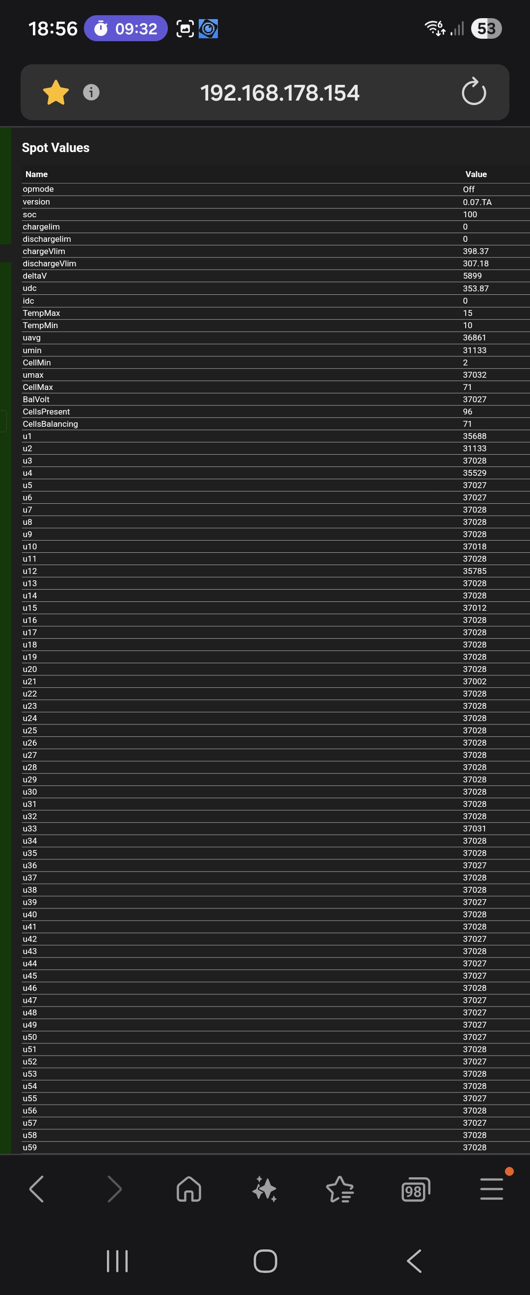 Slow balancing would be OK for me. I could imagine activating balancing after a full AC charge, and only then. So if I see significant differences, I'll just leave it on the AC charger overnight. I read somewhere that balancing can be enabled or disabled via CAN. The maximum charge and discharge rate should be determined based on the internal resistance of the battery and the open-circuit voltage. Perhaps a temperature correction could be added as well. The SOC should be determined approximately by the open-circuit voltage of the battery and a characteristic curve. I could also imagine a +- calculation of the energy going in and out, which is reset when the battery is completely empty or full. How is it done with your BMS?