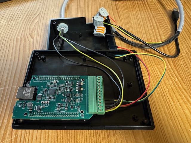 Regarding the power supply: on my side I have the old FoccciCape which has no 12V-to-5V stepdown converter, so it runs with 5V from USB power bank. The new version with the stepdown needs at least 7V, or, alternatively, a stable 5V can be injected behind the stepdown directly on the 5V rail.