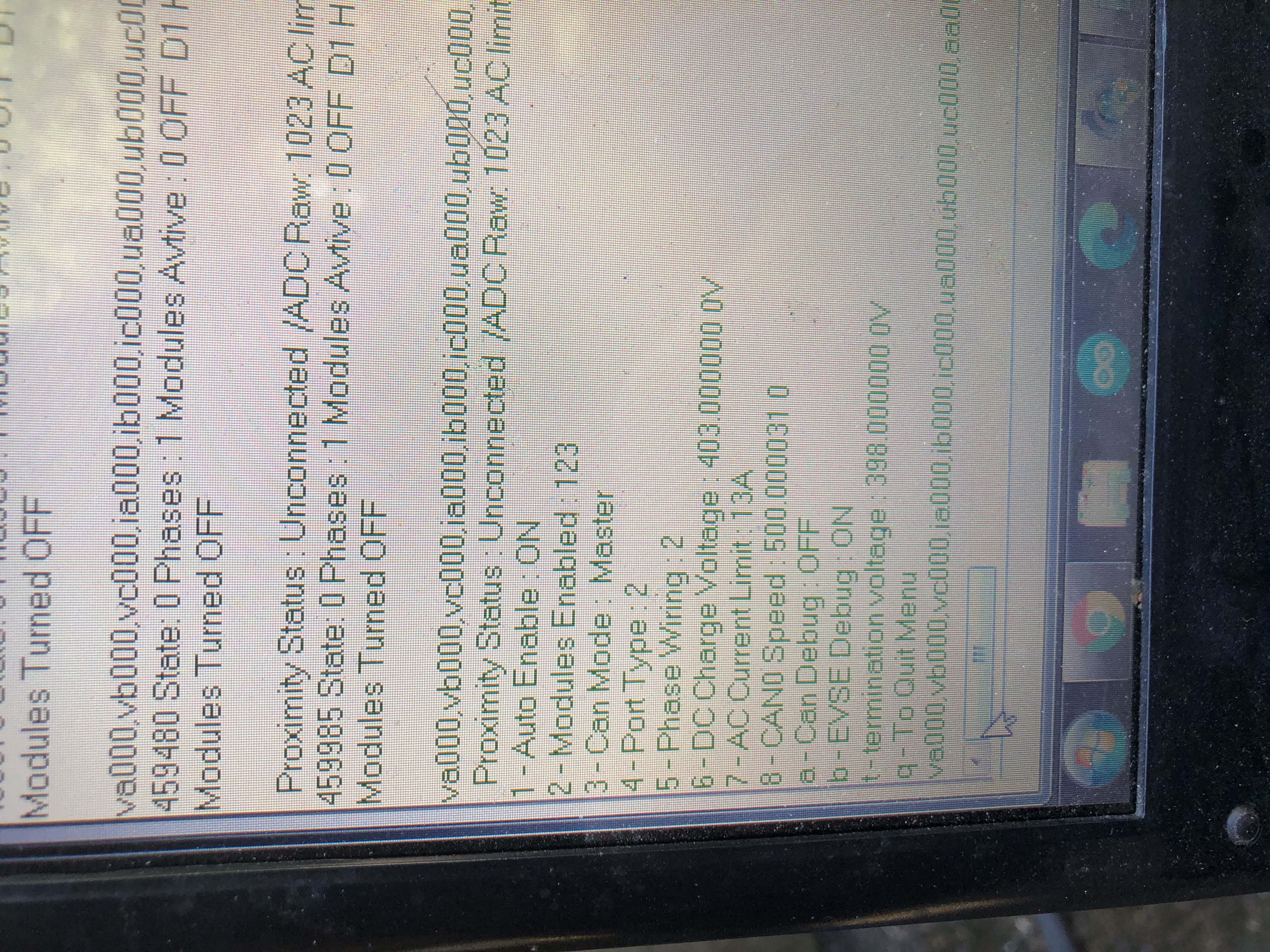 Proximity Status : Unconnected /ADC Raw: 1012 AC limit : 0 /Cable Limit: 0 /Module Cur Request: 4444 /DC total Cur:0.29 /DC Setpoint:400 /DC tVolt:400 /DC driven AC Cur Lim: 9709