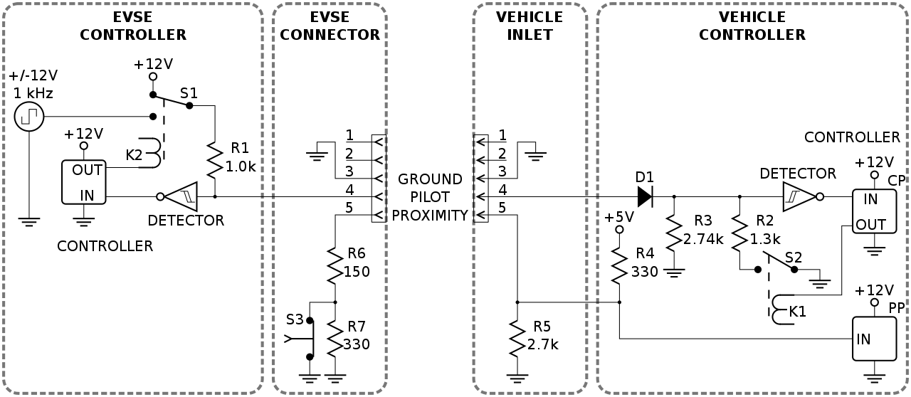Page 35 shows a J1772 (Type 1 plug) PP circuit used in the US on top and a IEC 61851 (type 2 plug) circuit used in Europe on the bottom. https://www.researchgate.net/publicatio ... _Standards