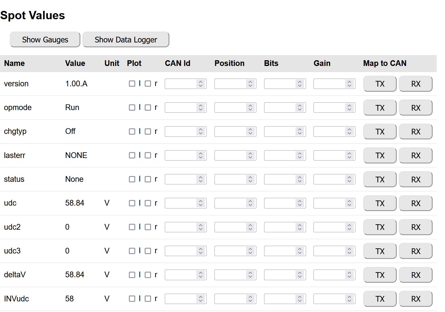So following Damien's post earlier in the week, I loaded up the binary from the link he posted and did a quick test with my GS450H setup. For the first time there was a whine from the inverter/gearbox, InvUDC was reading correctly, I could plot a torque curve (0 to 1000, where all previous binaries didn't give me any torque plot), InvStat never changed to 'On' though. Selecting fwd or rev, and pressing the accelerator pedal the gearbox would rotate a little but I was using a cheap 60V 3A or 5A supply that tripped out. I noted 'regen'travel' was set to 30% so figured I'd to a new test changing that to 0% and change over to some 12V batteries in series for the HV.