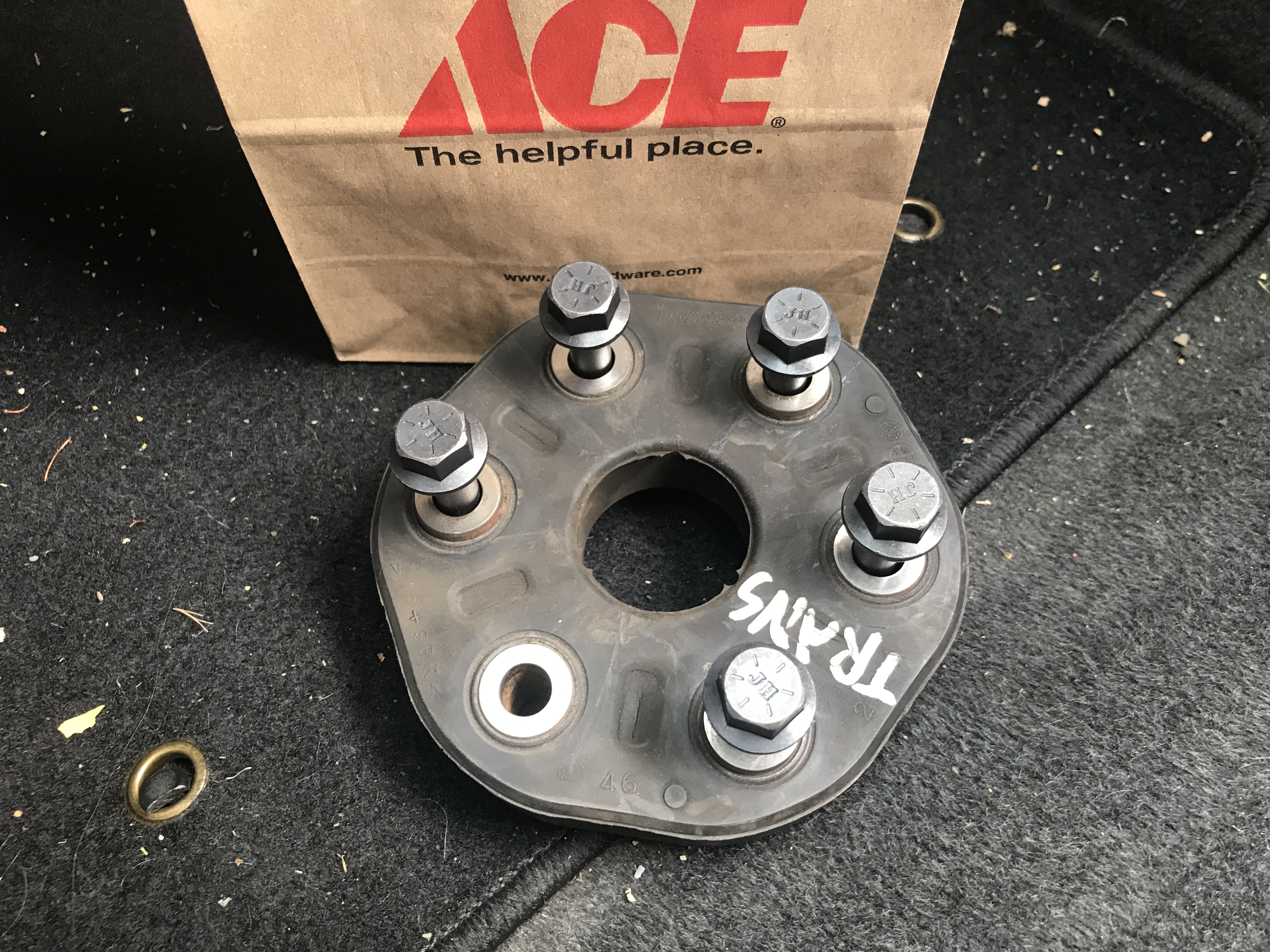 so in an attempt to mount the driveline proper I headed on over to my local hardware store called ACE Hardware for SIX new bolts (I figured since they will spin in circular formation, having them all be the same would be swell)