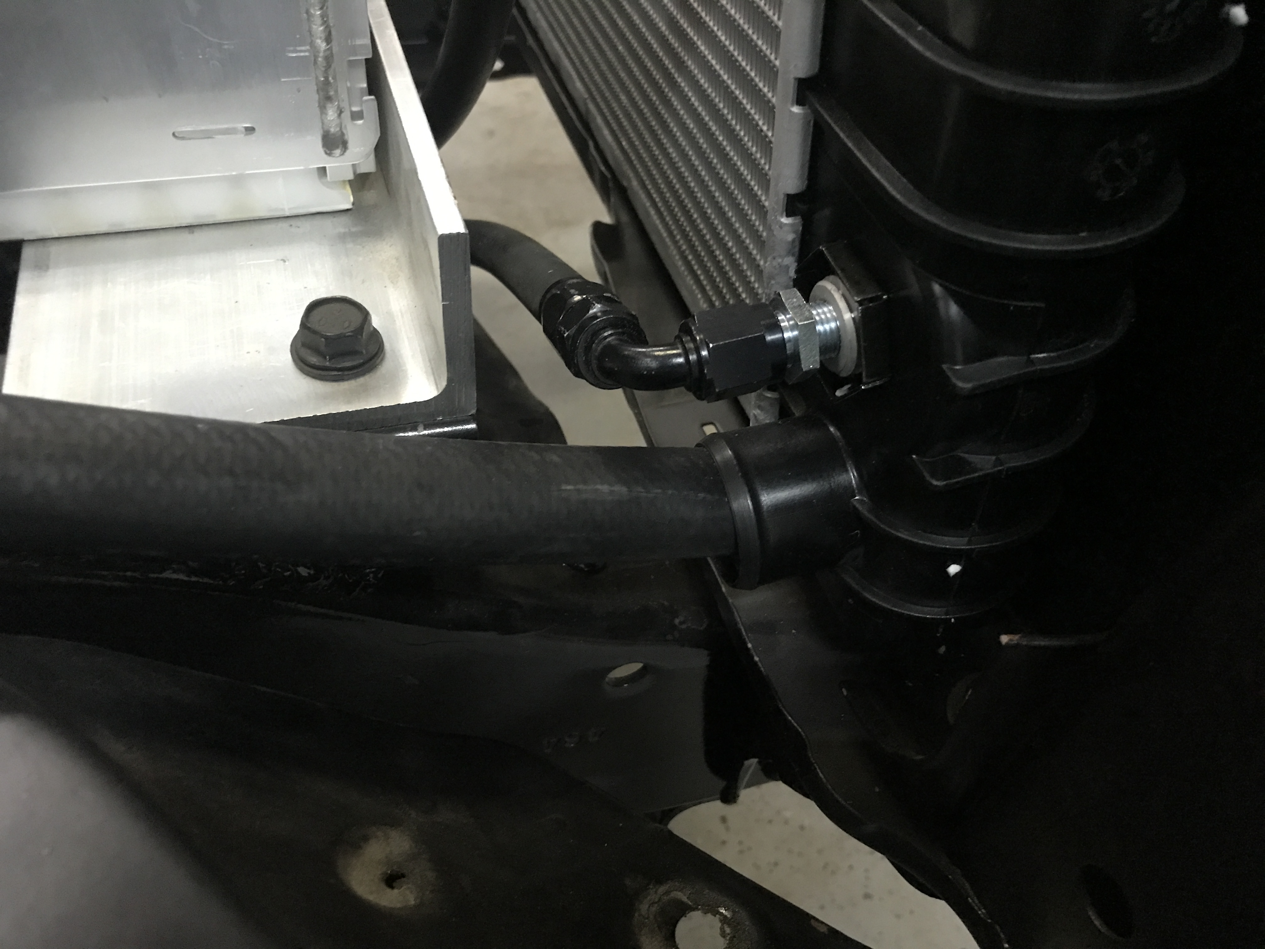 so while we wait for a sucker I mean a friend to come over to help me bleed the brakes for the upteenth and hopefully final time, The Greg decided to keep busy and plumb the Lexus GS450h transmission fluid lines to the 1971 Chevy stock radiator (as it has provisions for an automagical transmission cooler) using two 90° 6AN fittings and some 3/8th black rubber hoses
