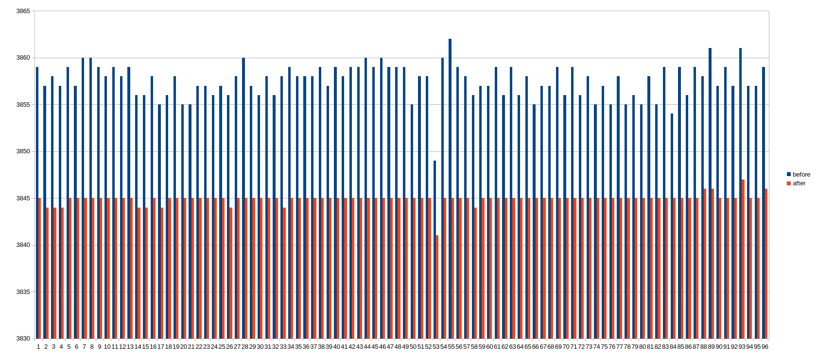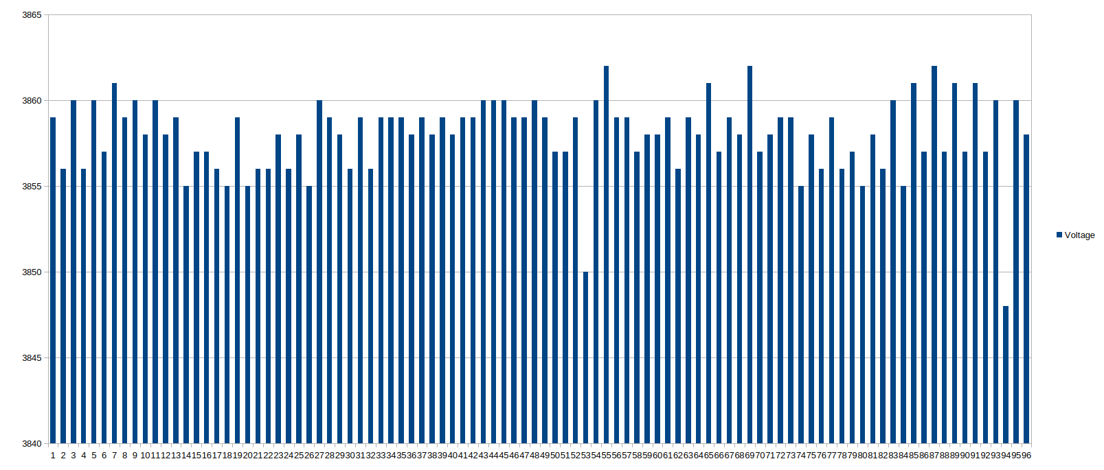 Two voltages stick out a bit. Highest is 3862 mV and lowest 3848 mV . so 14 mV Delta. will take a few more samples and watch these two carefully