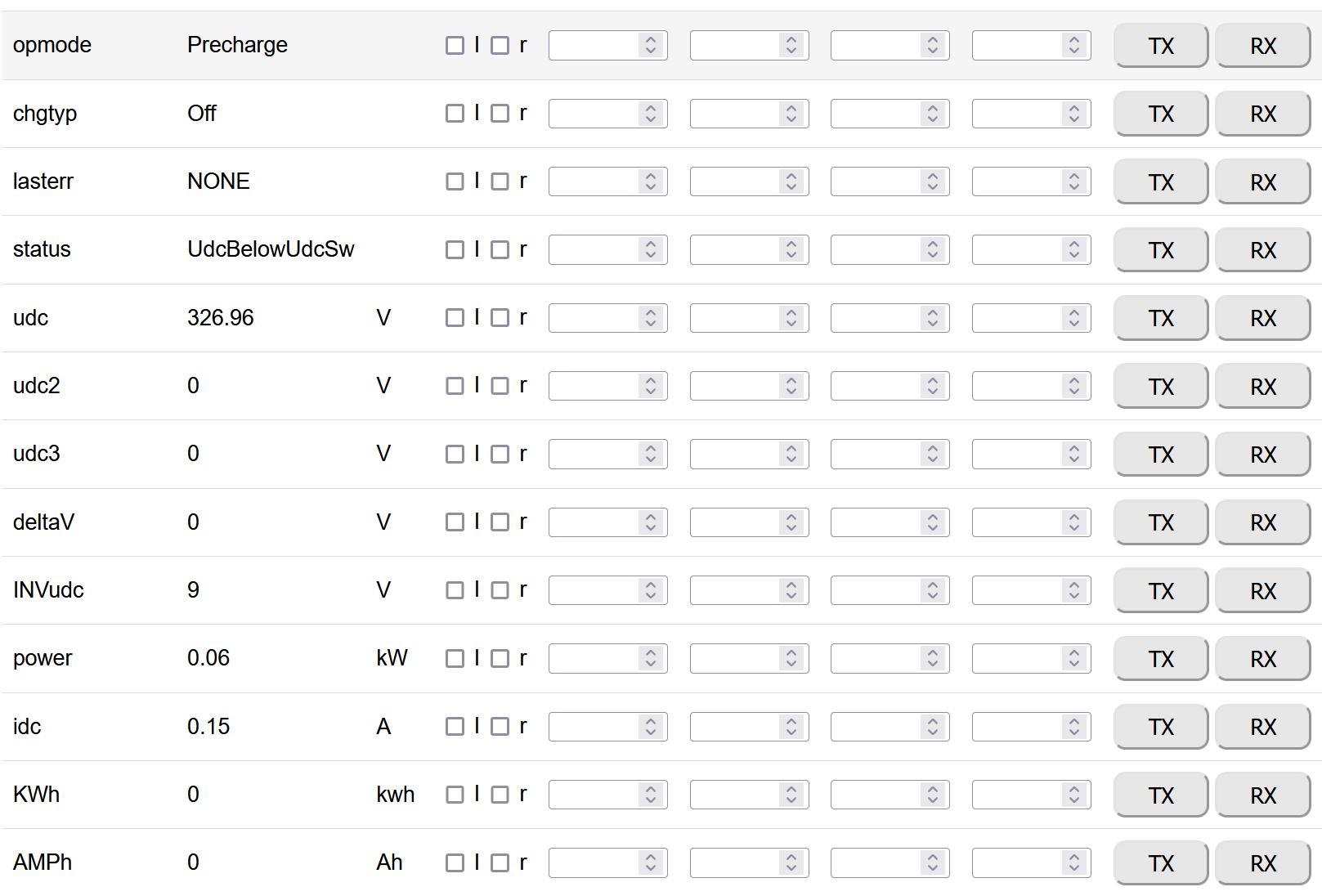 When you apply start signal, the negative and pre-charge contactors will close allowing the pre-charge. You will hold the start signal 'on' and once the pre-charge voltage has reached your settings (udcsw in the web interface), the positive contactor will close and the start signal can be disconnected. All three (neg, pre-c, pos) stay on then. Inverter power relay comes on at 'Ignition On' before start signal.Jonr wrote: ↑Fri Sep 23, 2022 3:47 pm Is the above correct?? - The problem is that on my system, when ignition is enabled, no relays/contactor are engergised