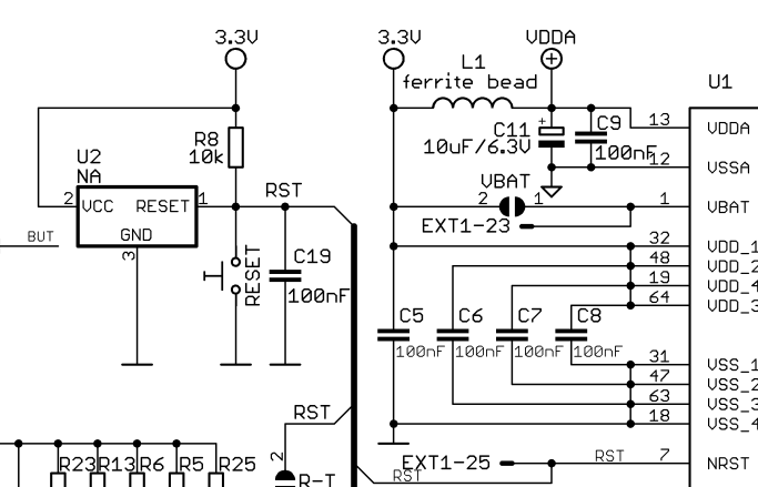 It has a rather elaborate reset circuit: But like said, the ESP on the same 3v3 rail also restarts, so it's not purely an STM32 problem
