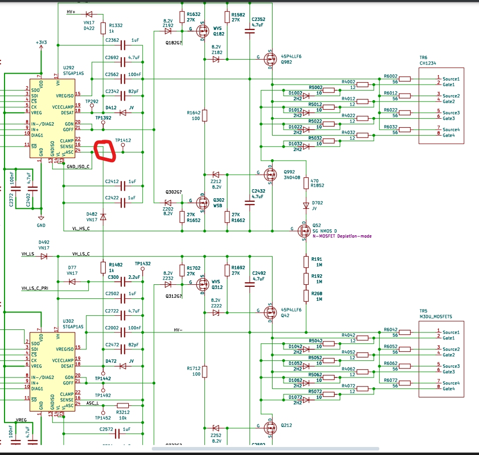 - GNDISO is at the source potential of the IGBTs through the 56R resistors,