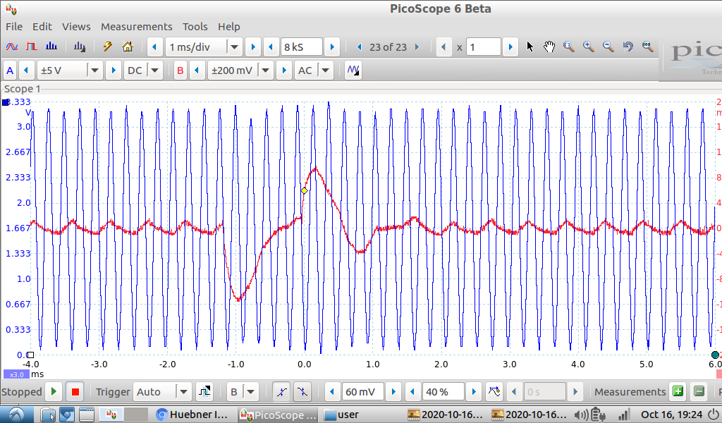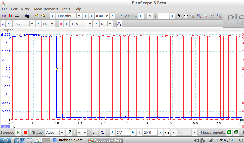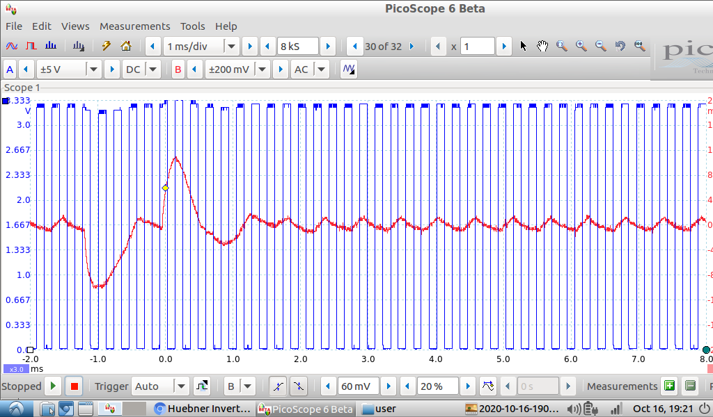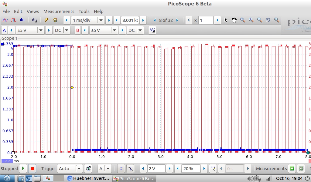 Look at this, blue is resolver exciter signal and red is the disturbing pin. And now, blue is resolver feedback sine input (R31) and red is the disturbing pin. And finally the timing between disturbance spikes. This is measured at R85 which is the output of STM32 pin 56 or PB4. This pin is pulled up to 3,3V with a 10k resistor (R85).