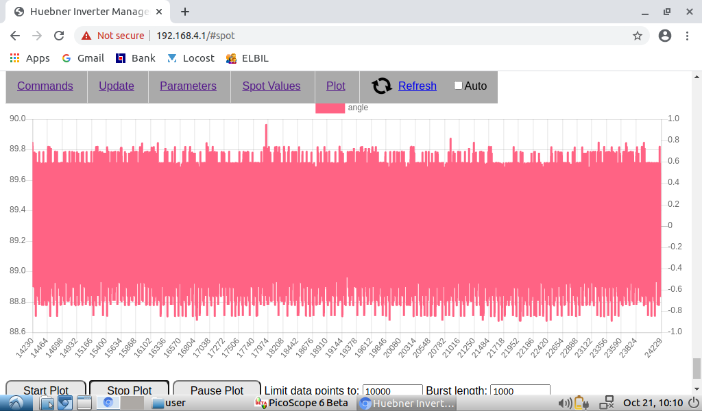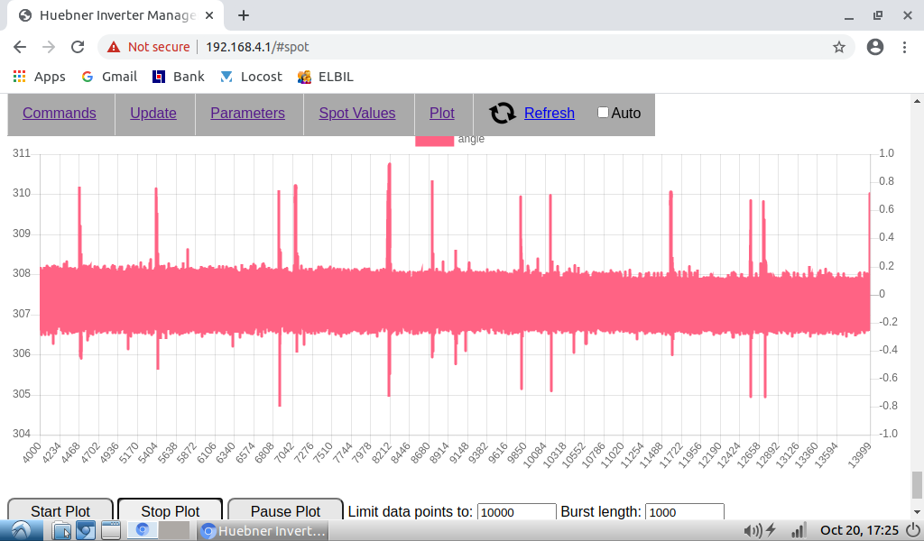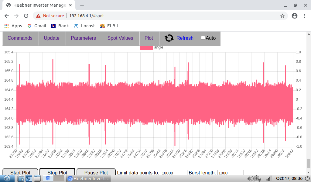 Also in sin plot the large amount of noise is due to the offset is not centered, positive values are closer to 2000 points and negative closer to 1900. Even though there is a calibration at startup. I guess the positive sin spikes also are limited by the 4096/2 bit limit.
