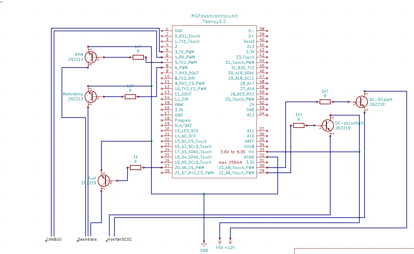 It's pretty simple on the inputs and outputs side, just the two canbus wires and then three signal wires from the dash. I also added in some controls for the dc-dc on my gen 2 prius inverter. Figured it might be handy to have some control over when that dc-dc starts and the output can be controlled with a 0-5v signal. Not sure if the transistors are really the correct tool for the job there, but for now they are just place holders.