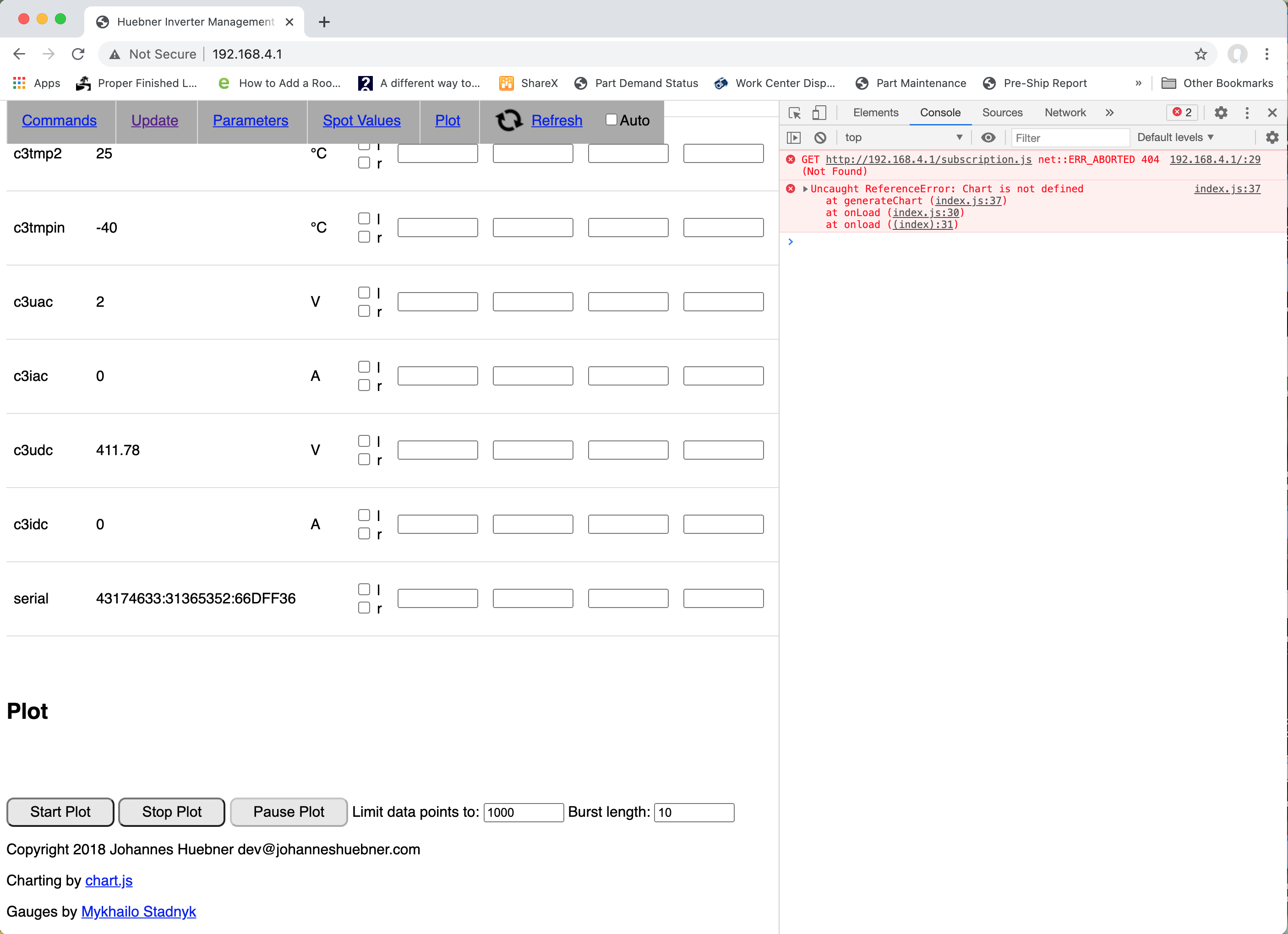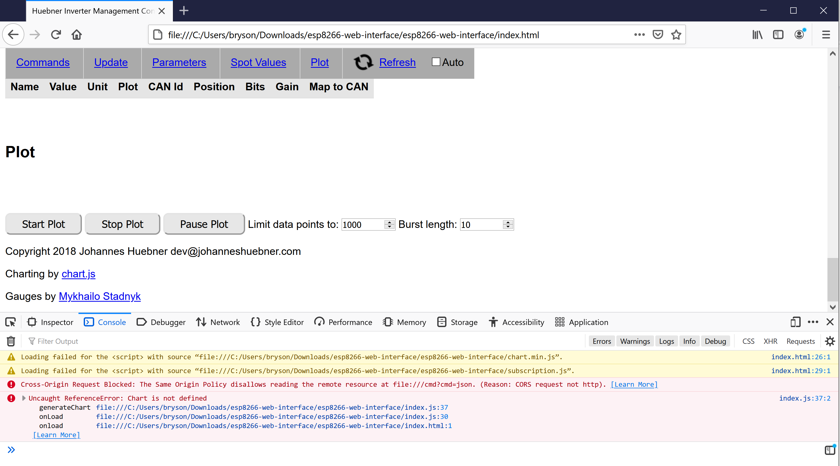 Screen grab with error log from Chrome. Should I just load the unpacked file directly? The plot chart shows up when I unpack within the same directory and reload index.html