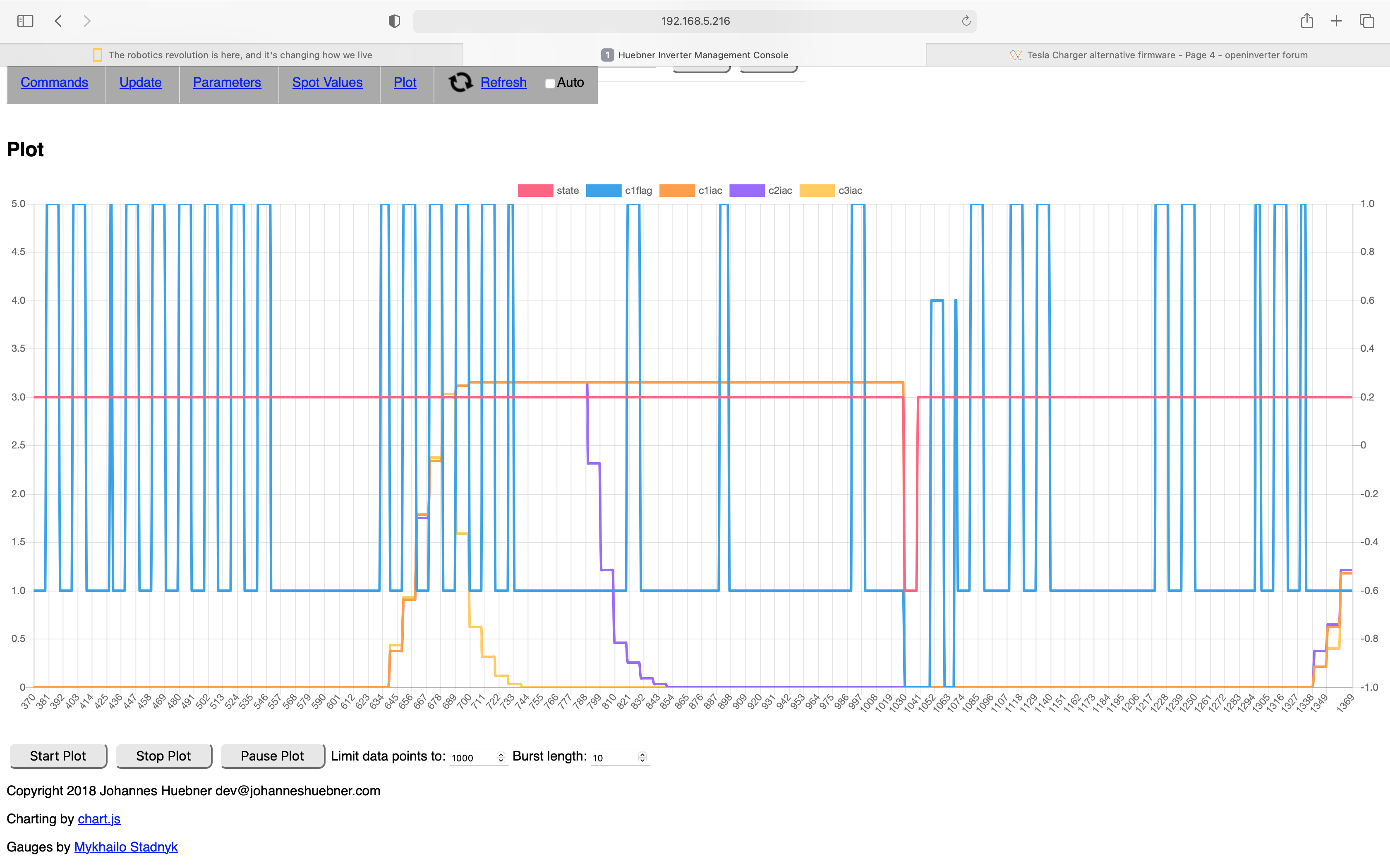 Next plot almost same but charger 3 signals an error, next plot also charger 3. Last plot doesn't show errors, must be outside of plotted range. Only charger that never shows an error is charger 1. Can you try enabling only charger 1? Type "set chargerena 1" into custom command. set chargerena 7 to enable all again.