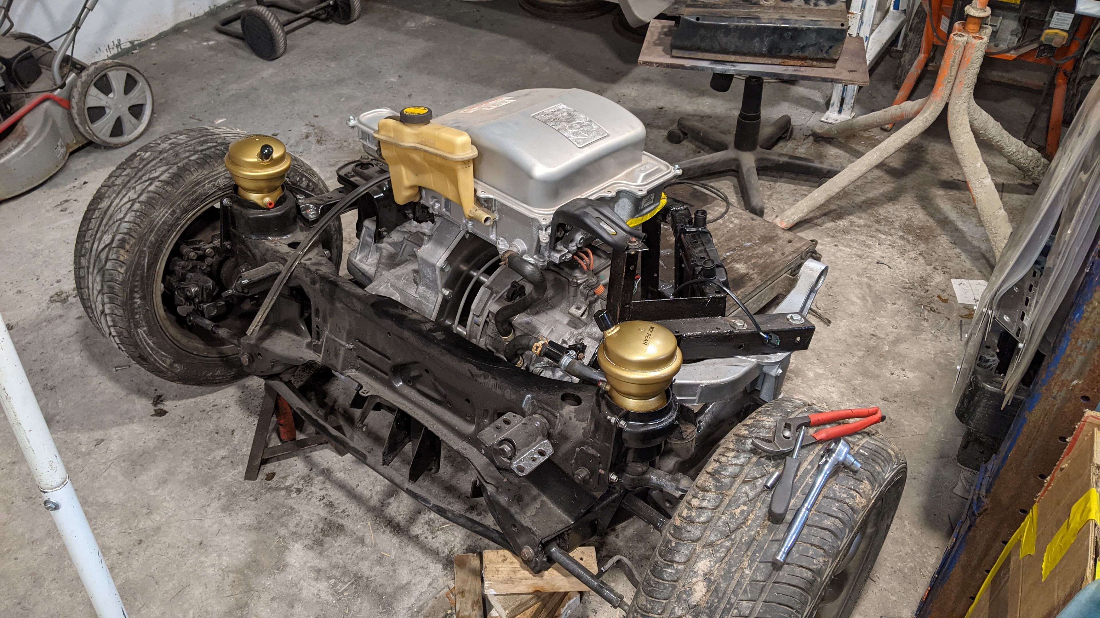 Still some work to do on this before it can go back into the car. I have installed some refurbished suspension spheres and I pushed the boat out a little to get some new shocks as well. I'm waiting on parts to finish the coolant lines, I need to add in one more motor mount support and redo the wiring loom from the inverter to the OI control board.