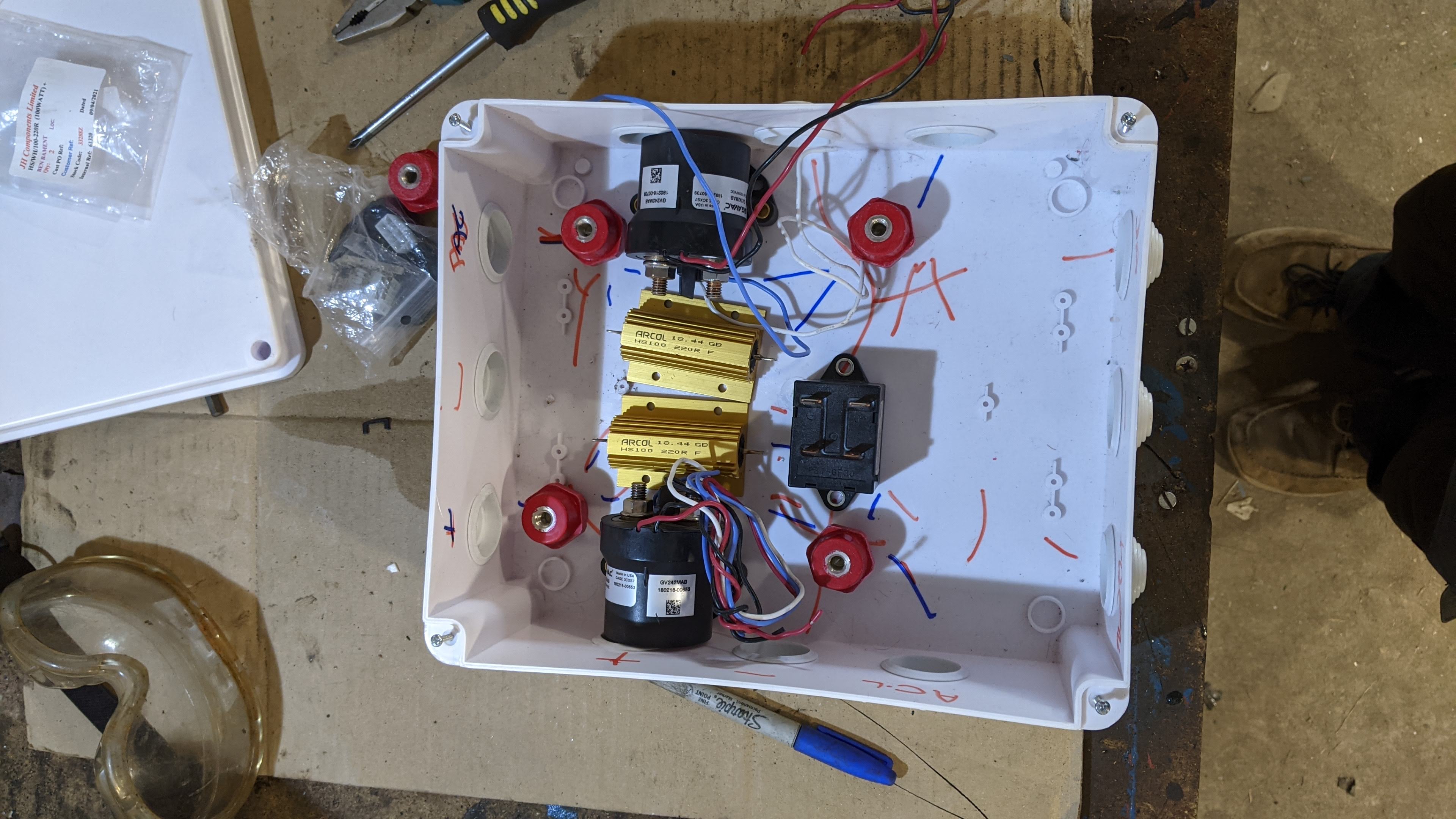 Made a start on this. This is roughly how some of it will look. Positive line on the left with precharge contactor. AC line on the right. Fuse and Negative contactor will be in the battery box. The negative line will come through this box but just be a standoff connector.