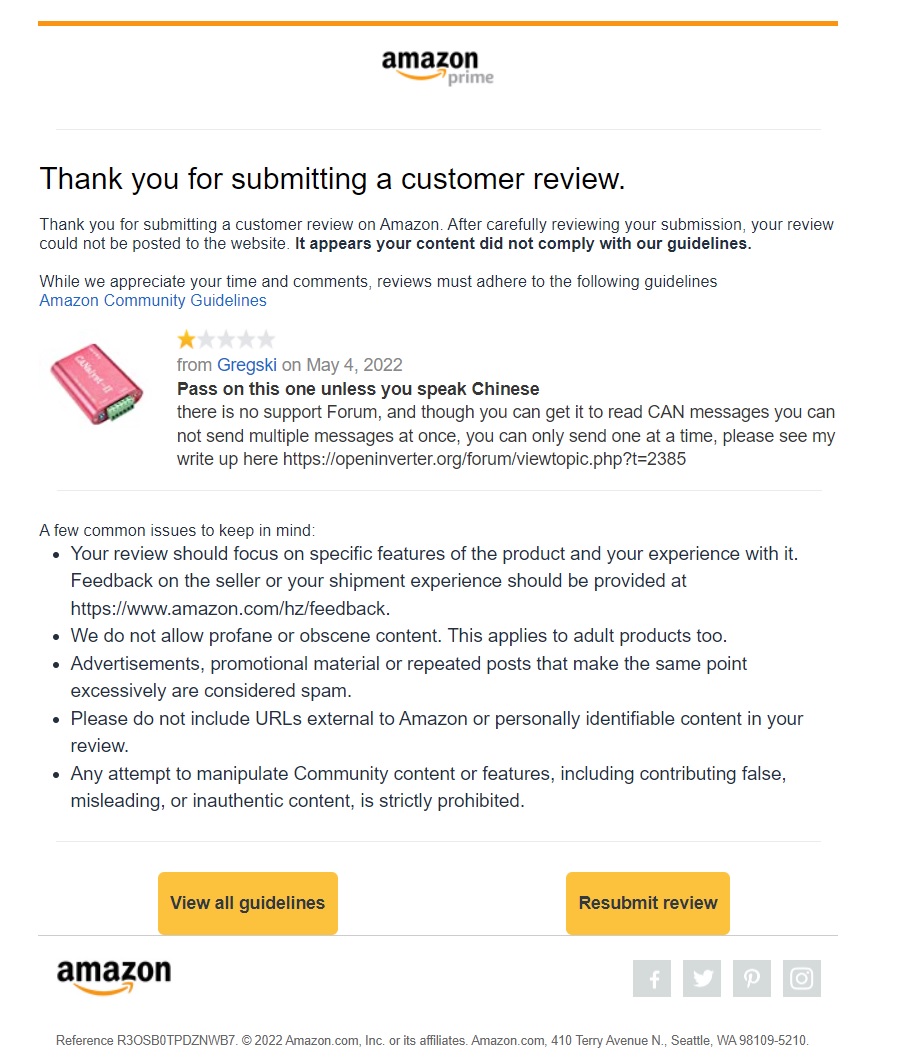Gregski wrote: Fri May 06, 2022 12:59 pm just when I thought I couldn't luv big corporations even more, comes this Amazon review submission rejection (my first one by the way)