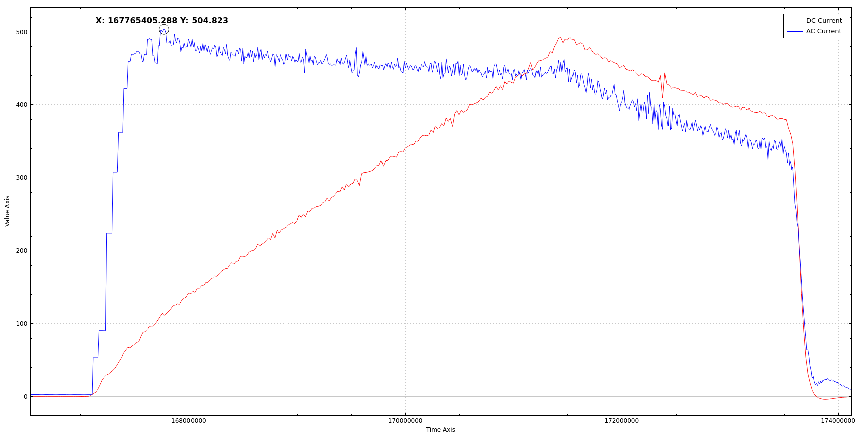 DC current: 0A to 475A then falling to 375A