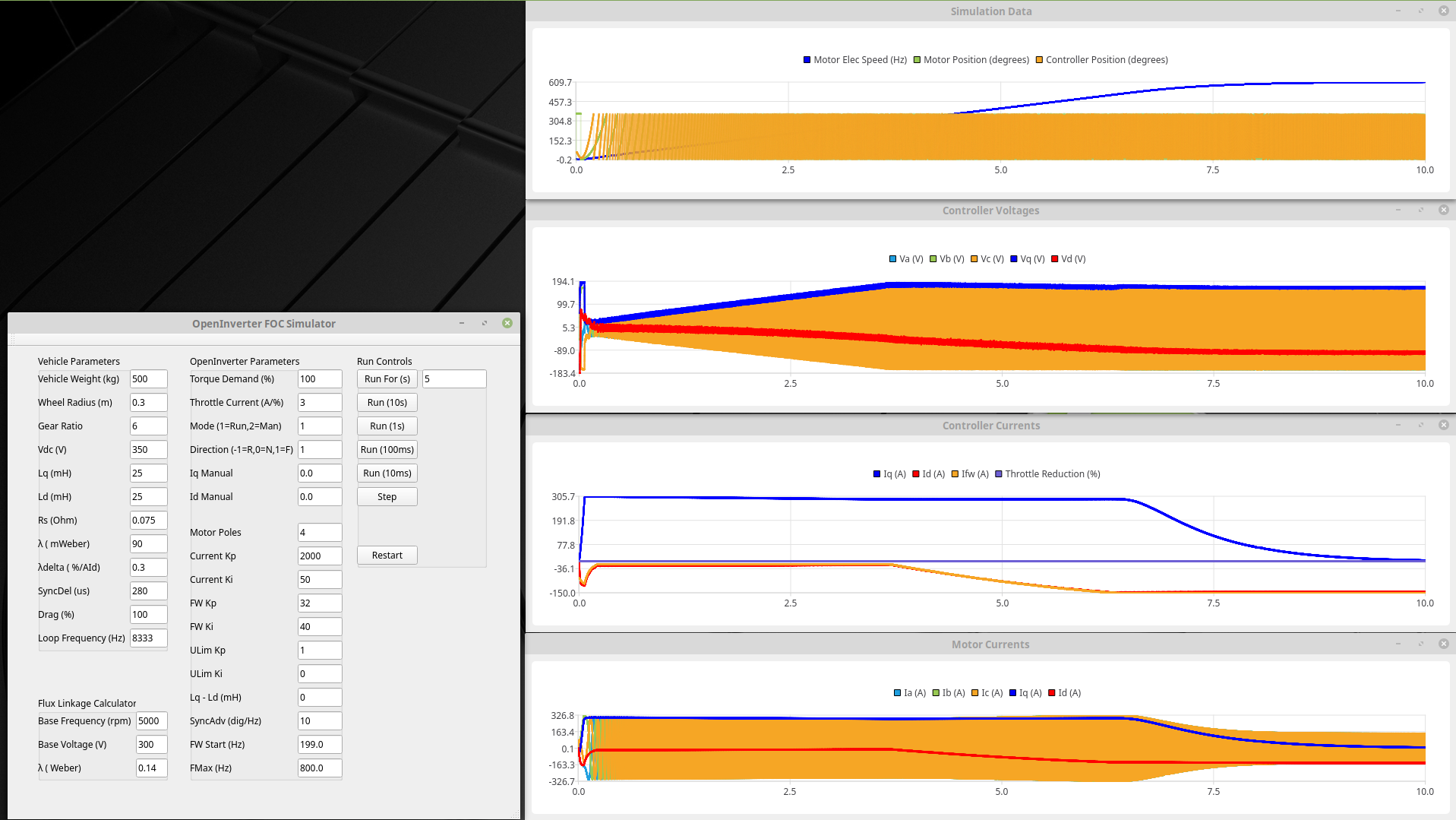 I'm thinking the half period age of both current and angle might be an issue with control loop stability. At the very minimum I think the loop gains will need reducing from the simulation values. Not sure whether I'll get to it today but will try adding another parameter for the model to allow the sample age to be simulated and varied. Little more involved than the SyncDel as I'll need to calculate two sets of numbers, one for the internal model and one for the values reported back to the OpenInverter code. This is where your idea of a hardware simulator would be nice as it would include all these things (including any phase delays though filters or IO processing blocks)!