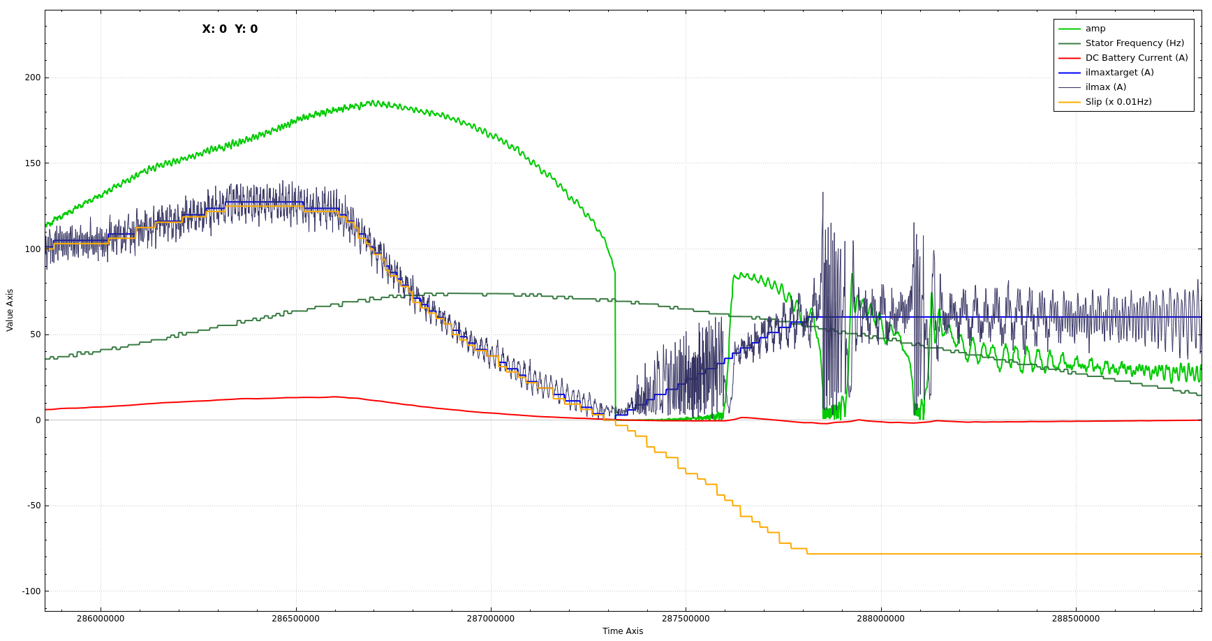 Once I started using fslipmin, I was able to notice a second (and more expected) issue that causes the same effect, very sudden changes between positive and negative torque request. With the higher slip, it became much more noticeable that high throttle slew rates between driving and regen still upset it a little. It's worth noting that because of fslipmin, the *slip* transition is still instant, no matter how slow the throttle moves, but the current request tapers down to zero before coming back up. Looking at the charts, the defining factor that seems to solve the problem is that current much reach zero before starting back the other way.