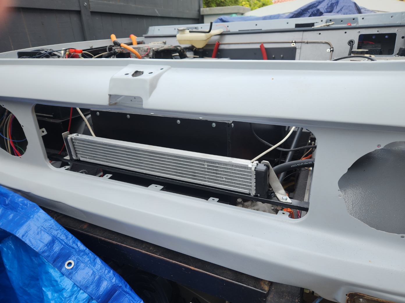 robertwa wrote: Sun Oct 20, 2024 6:18 am I finished my cooling circuit and tested it out. Using a small aluminium aftermarket radiator from a Prius. Unfortunately, I do not have room for a fan behind this due to the battery pack, hoping the cooling will be adequate. In prior tests with a manual setup, the Outlander charger was getting pretty hot without a fan,