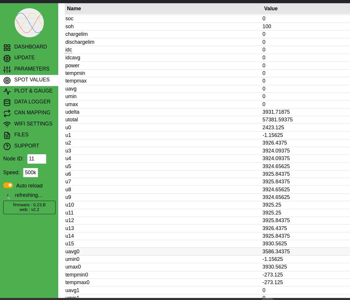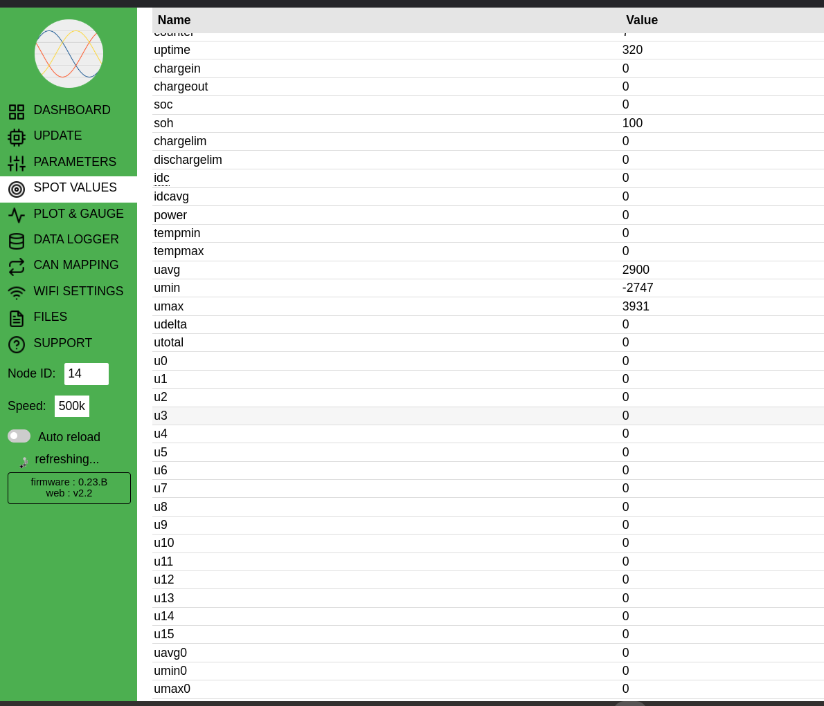 You can see the issue at 2:43 and 4:09—umin drops to -3.9V or 0mV, even though there are no cells with 0mV or negative values reported. Delta also reflects these incorrect values. In charts, I see some kV readings or 0V spikes.
