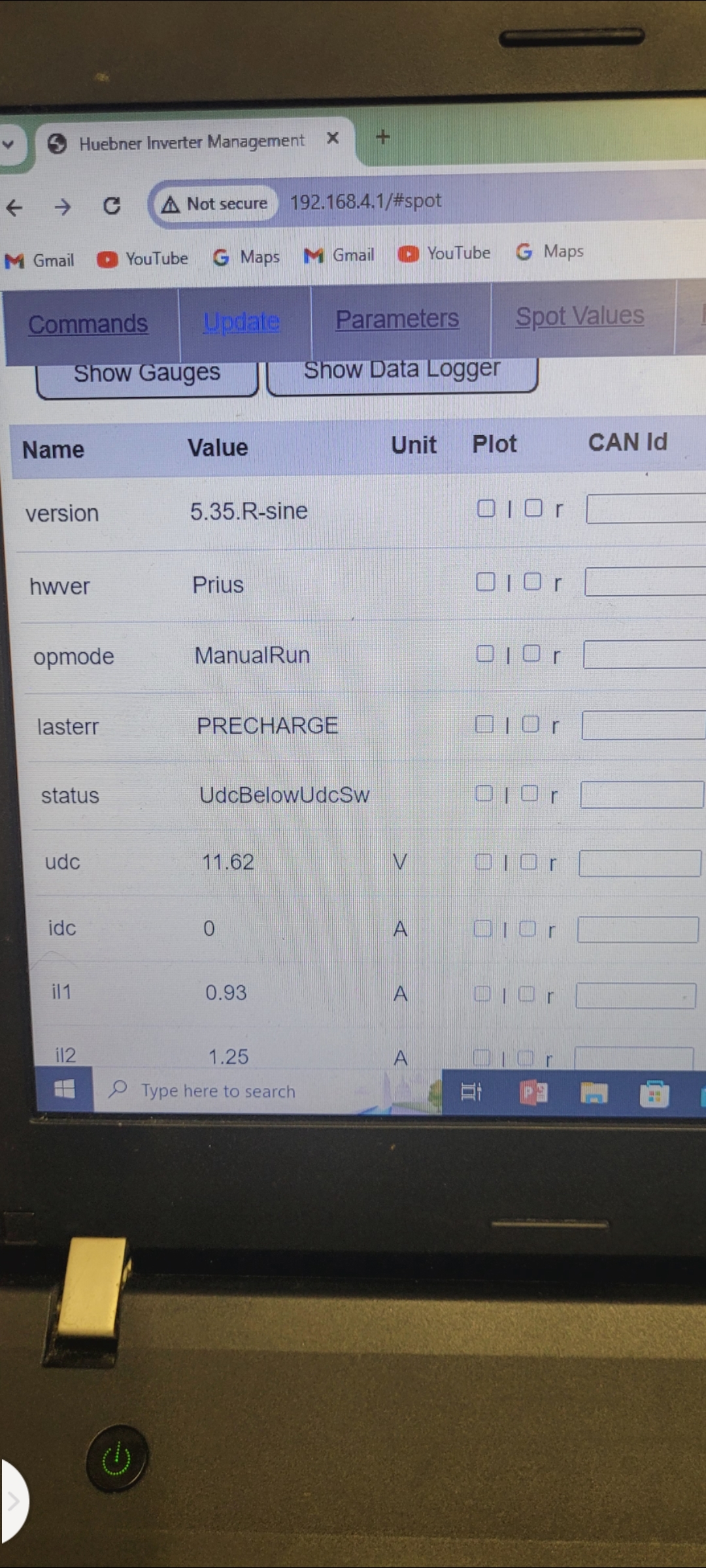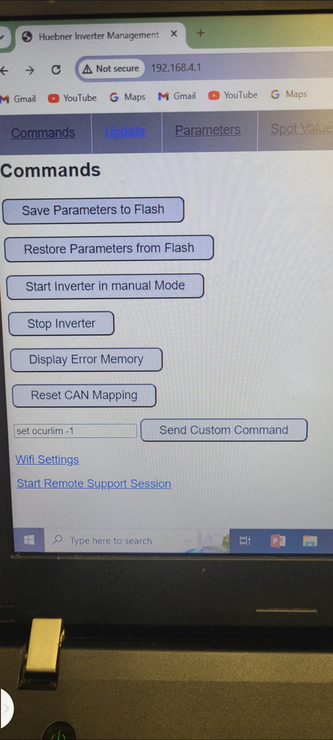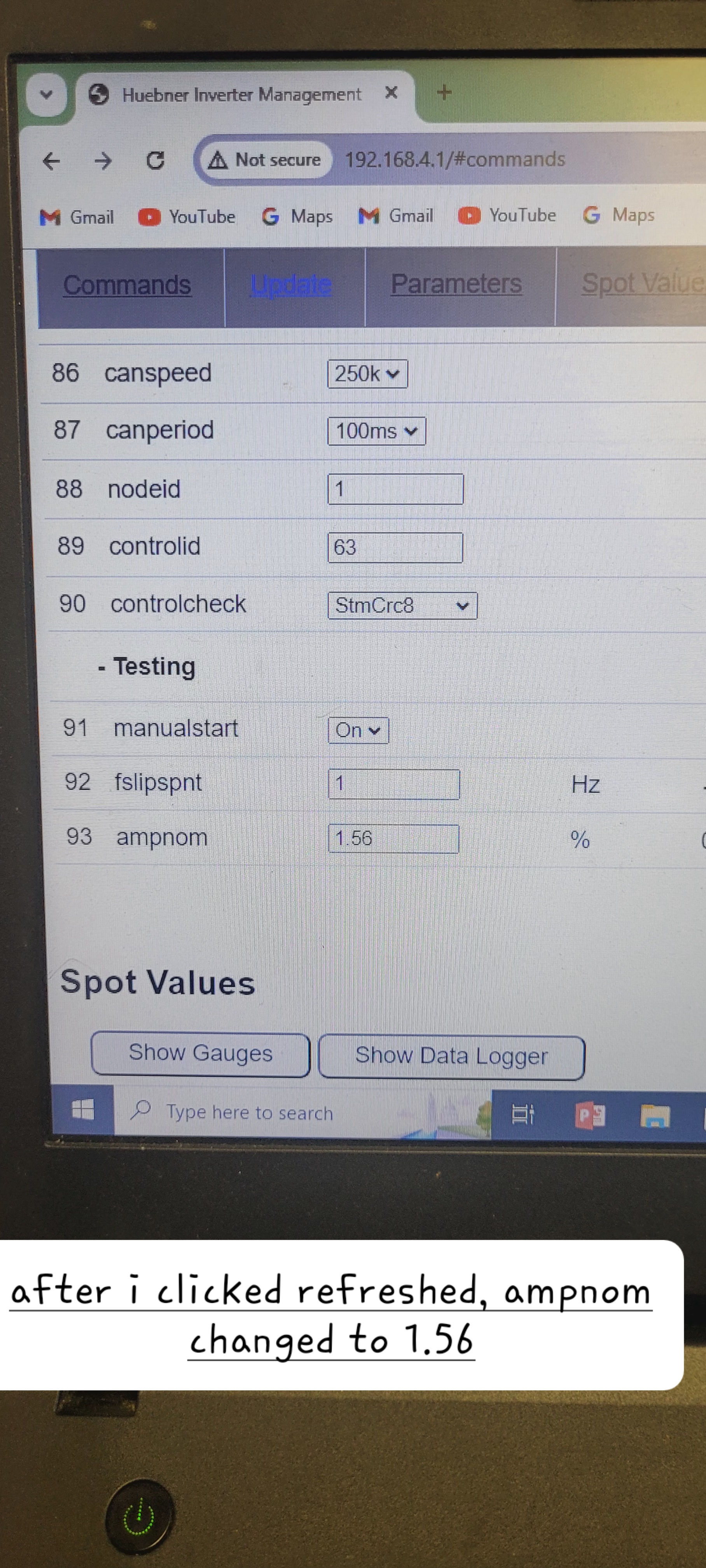 Then from there I logged in the web Interface, set ocurlim -1 ampnom 1 fslipspnt 1 selected manual mode and hit start inverter in manual mode. Went to spot values, refreshed and confirmed manualmode.