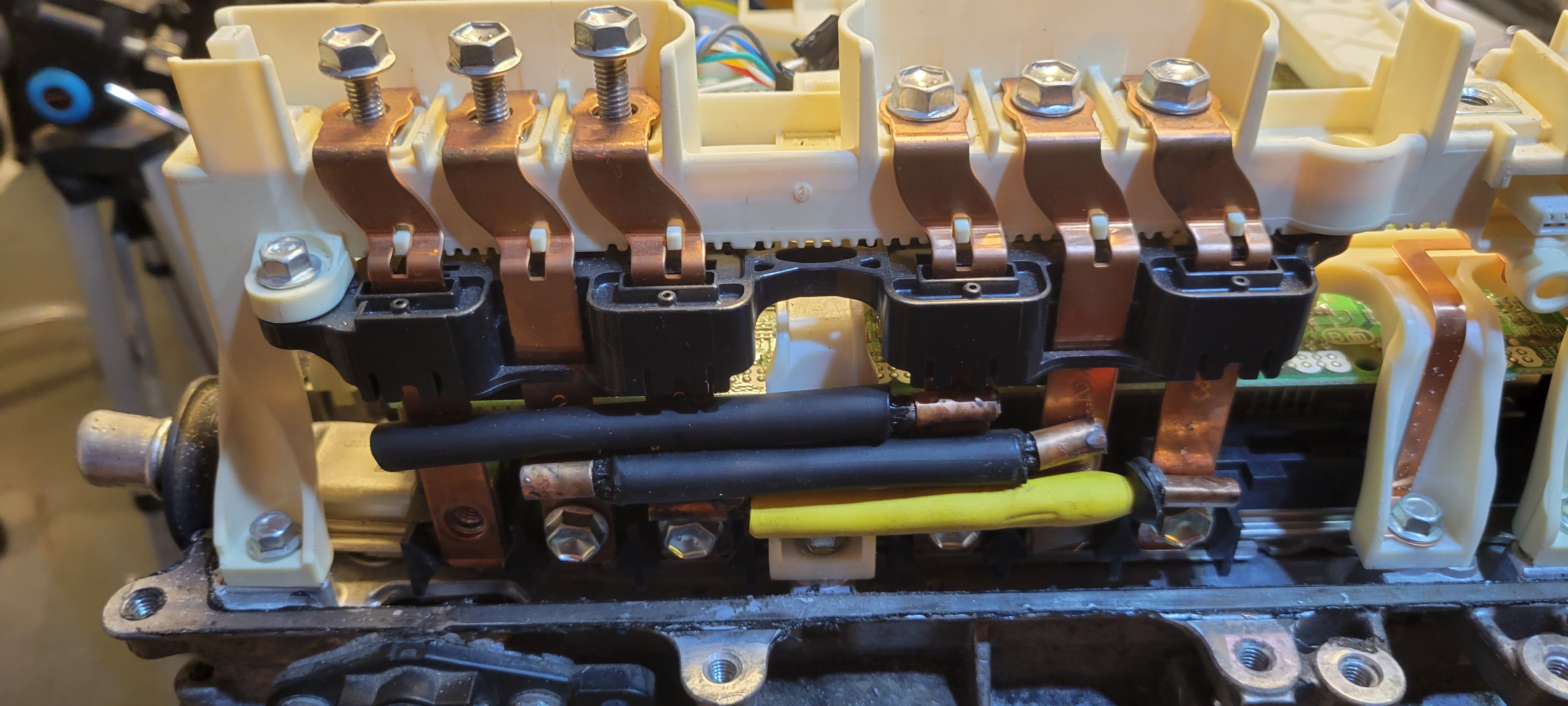 To date I have only been using half of its outputs – so called ‘MG 2’. But my control board supports me driving MG1 as well and bridging the outputs. This requires some simple soldering of jumpers on the control board (done) and then bridging the phase outputs on the inverter itself (half done). I’m using short lengths of 20mm2 wire for this, and fabricating copper connectors on each end. This is a bit of a pain of a job, but I’m getting there. Five connectors down and one to go. And some tidying. I want to clean up all the connectors and maybe add some more insulation, assuming it will fit inside the case.