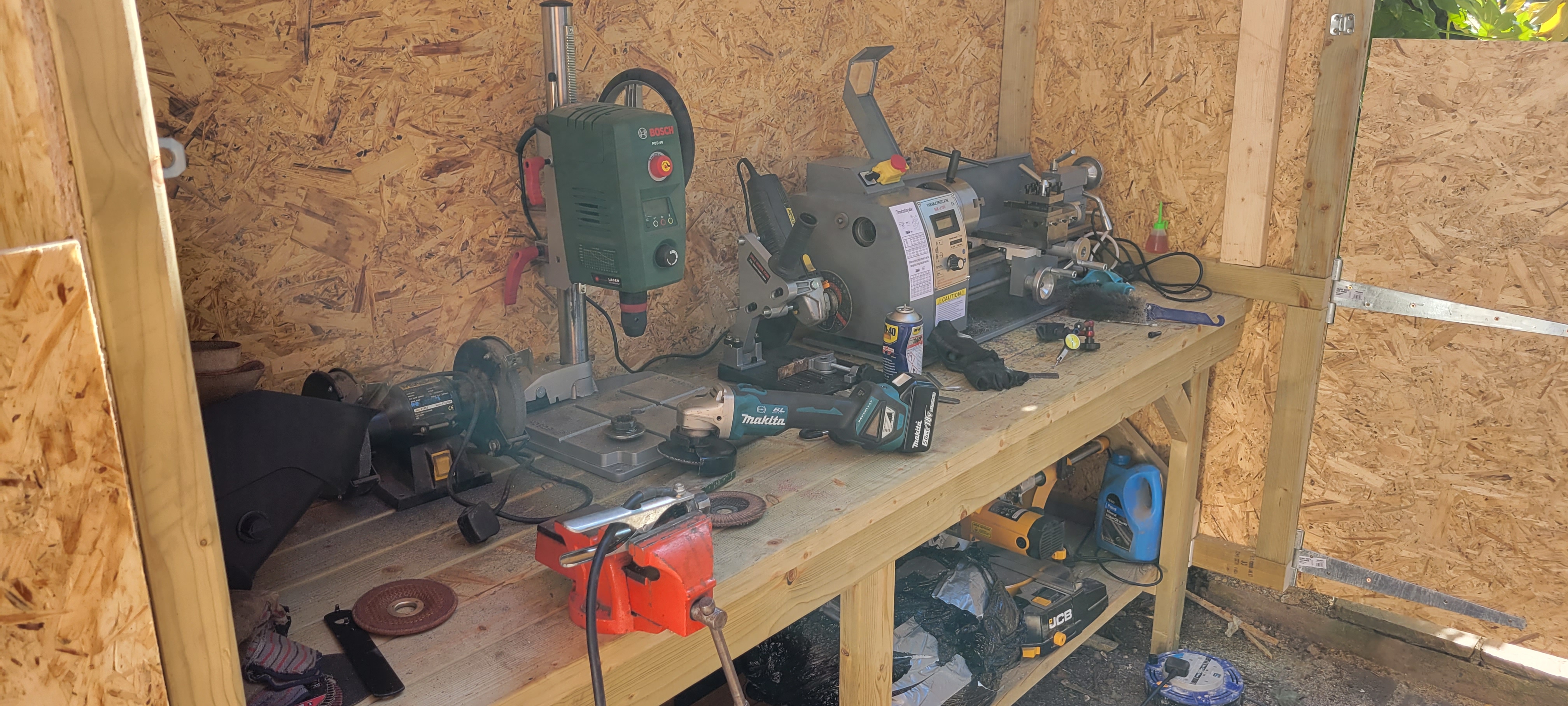 The other part was the coupler, with which another friend couldn’t help. But in some ways I was quite pleased by this. I like the idea of doing it all myself. So, I did what any normal person would do: built a machine shop in the back yard. I bought a workbench and boxed it in with waterproof OSB and a felted roof into a sort of mini shed. Well, I say ‘mini’. You may not be able to get inside it but it is 2.4m long and now contains a pillar drill, lathe, chop saw, bench grinder, vice and welding station. The lathe is nothing special: the most expensive, cheap Chinese beastie I could justify. First experiments have been reasonably promising and with some practice (it’s 25 years since I used a lathe) and some additional kit, I reckon I can make up a straight coupler. The process is much like last time, just with a little more precision:
