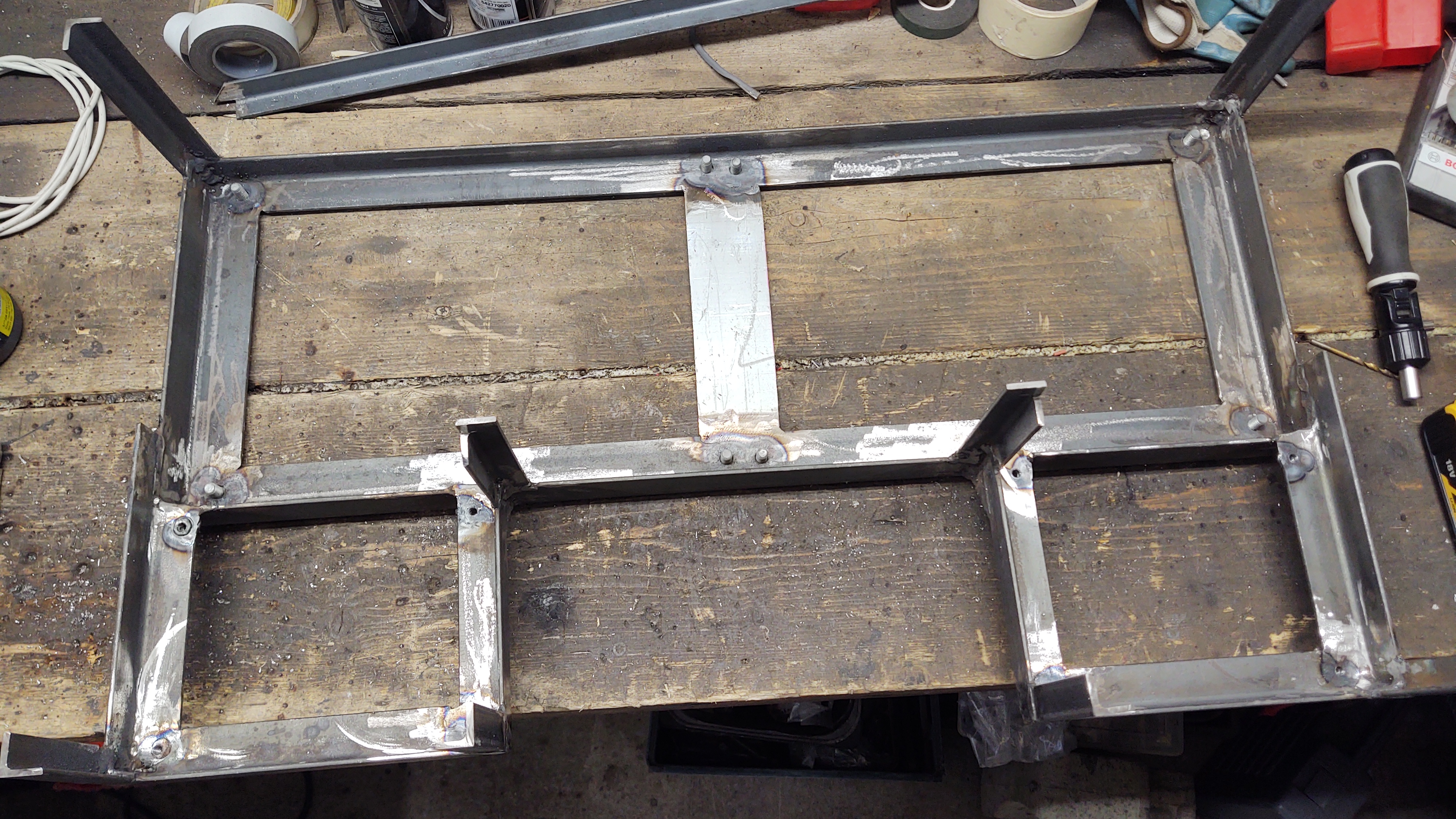 So now I finally have the modules secure I can finish the top of the frame and think about fitting the sides, after welding in another two uprights on the sides that is. The front of the lid will be higher than the back to allow for sticky out bits in the car.
