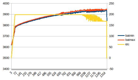 The difference in voltage from 0A to 200A is 16V or 169 mV at cell level. That would be 80 mOhm for the whole pack and 0.845 mOhm per cell. Close to spec of 0.74 mOhm.