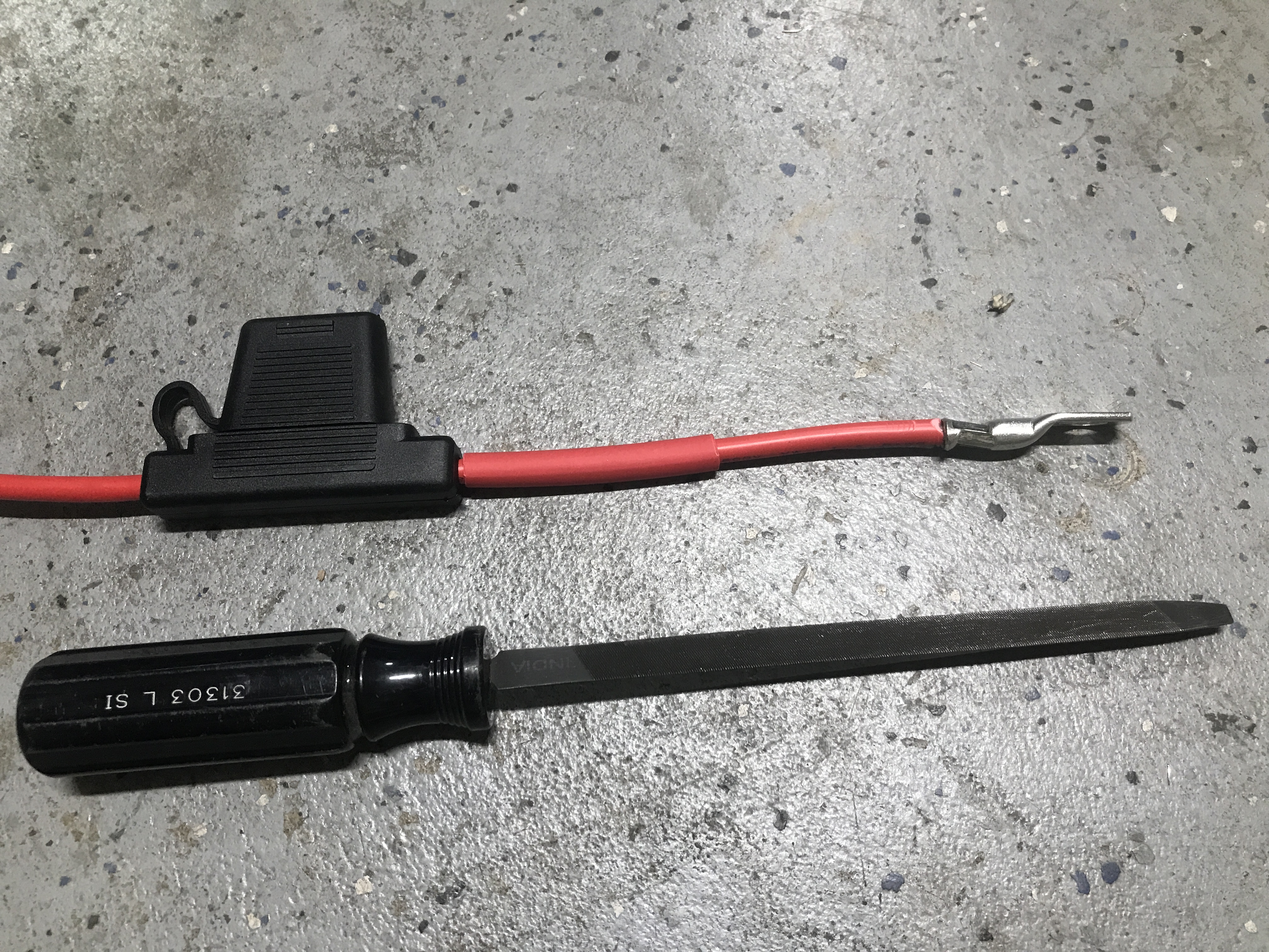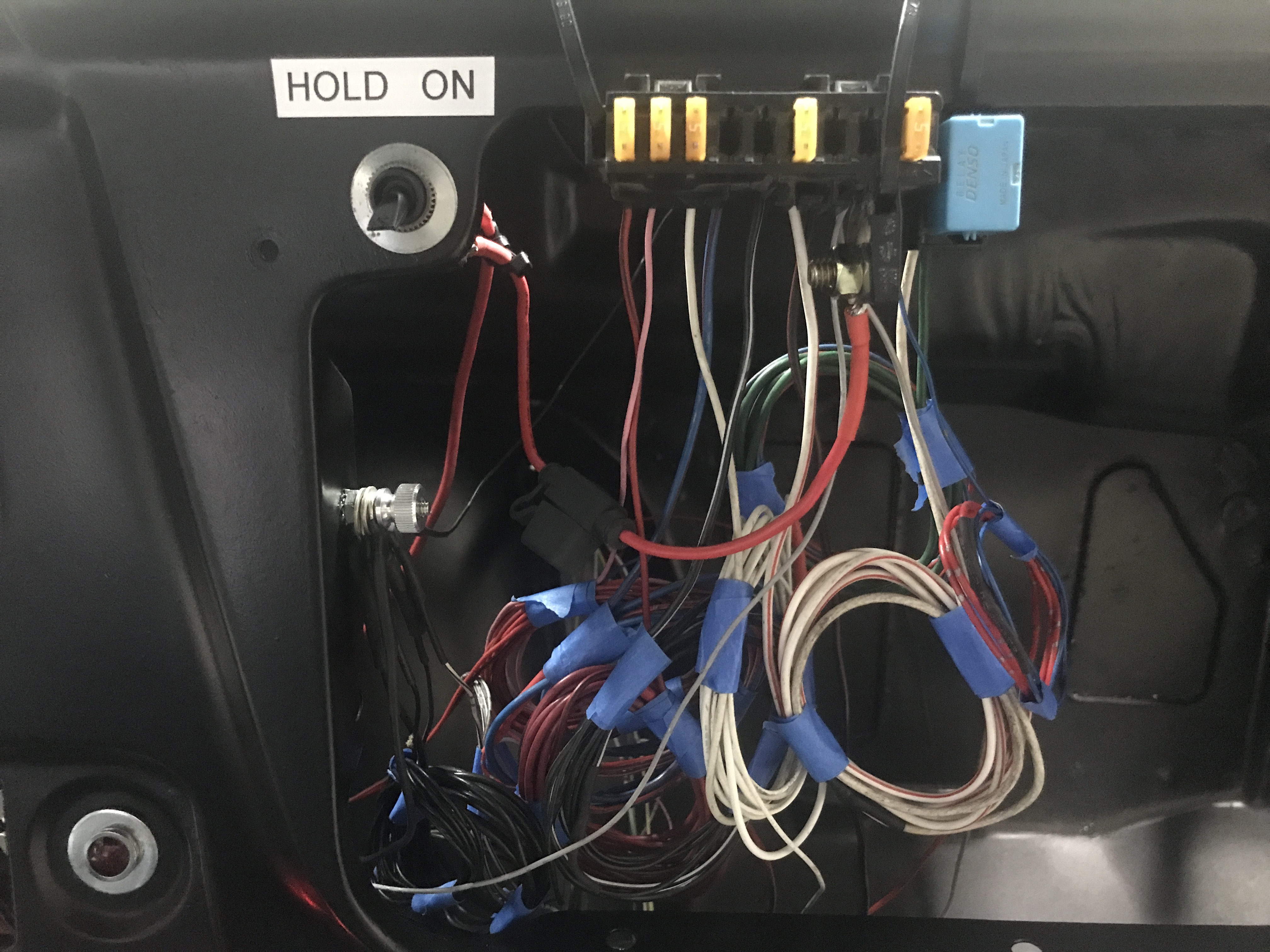 Alligator clips be gone, she's all hard wired now. Introducing the line up from left to right [on the fuse block]