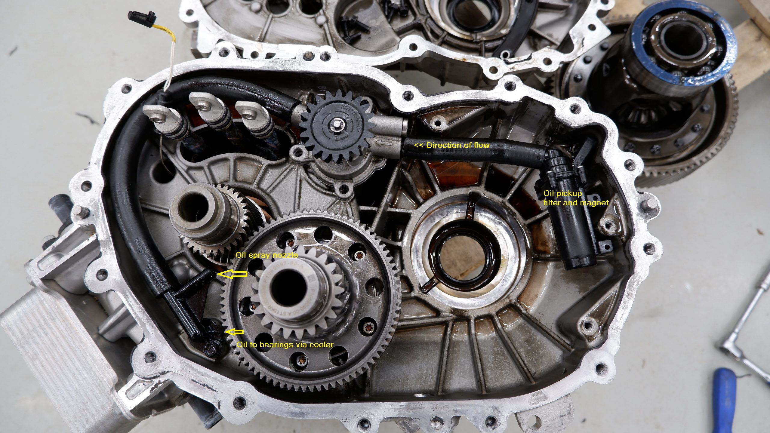 That is front drive unit from a 2016 Model S Performance. The picture is kind of upside-down - the pickup is in top right corner where the pump (with black plastic gear) sucks and the oil travels though the hose into a cooler. There's a nozzle on that plastic piece in the end of hose where the oil goes between those gears.EV_Builder wrote: ↑Sun May 09, 2021 10:34 am Is that front drive unit? Or model X rear? Can't place the cooling mounting. And can you exain how the oil travels?