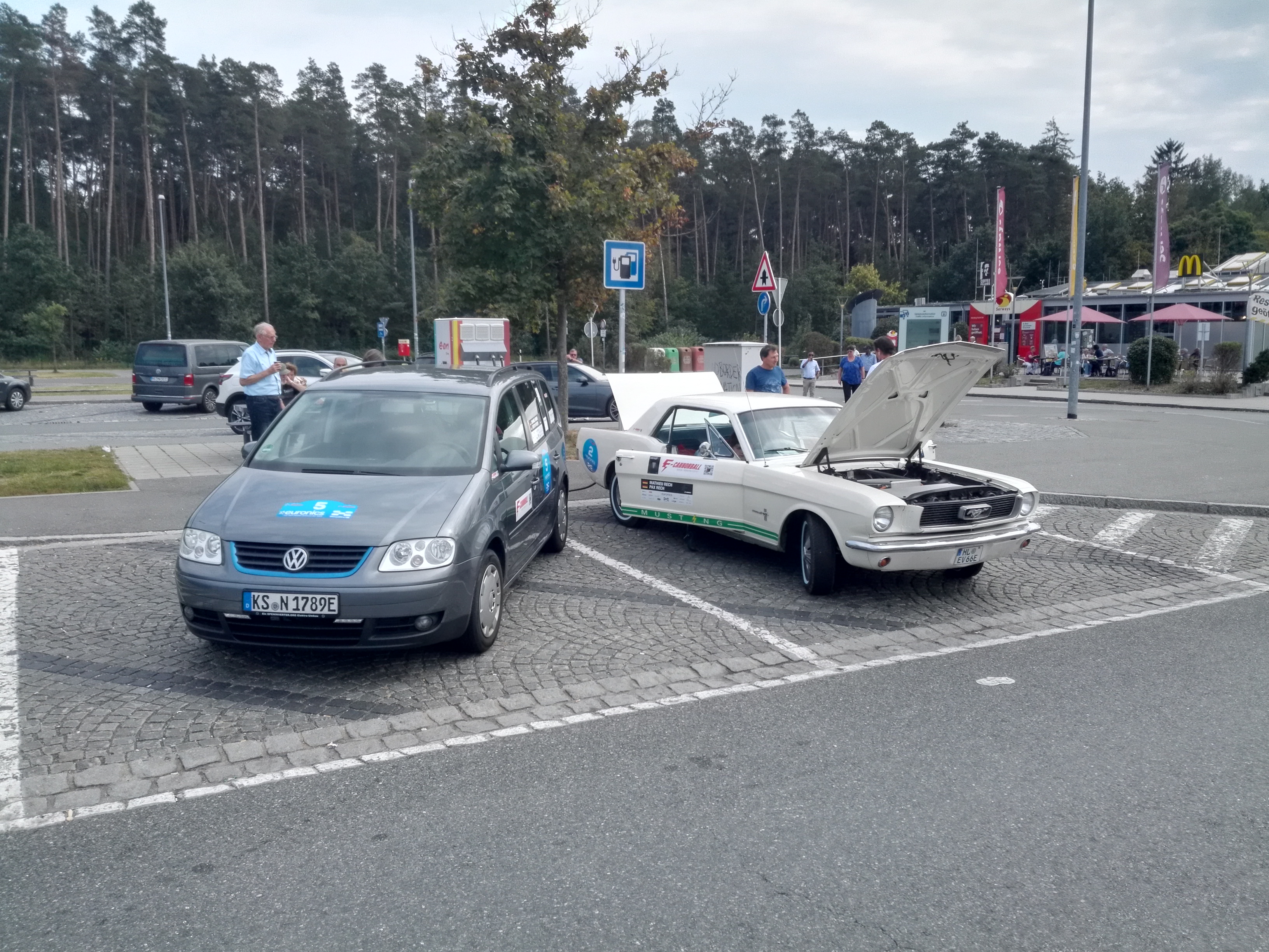 Finally yesterday we drove back home to Kassel which was another 500 km. That time it went semi-good. We actually met Mathieu with his Mustang at the first charge stop. He was using the full 43 kW AC power of a triple charger and the charger didn't allow us to start a CHAdeMO session in parallel.
