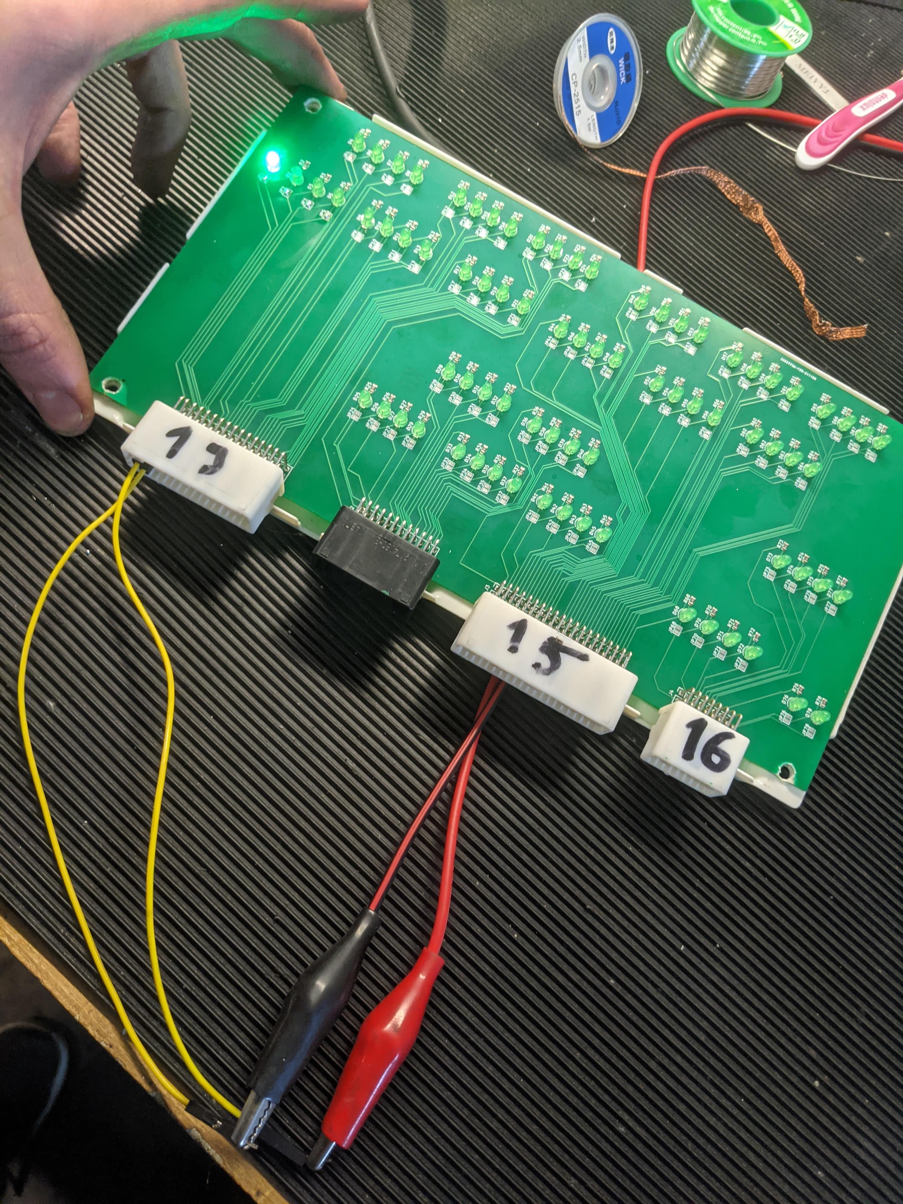 You can see one LED is off, thats where I made a wiring mistake on the board and connected both sides to the same cell. Everything else works perfect, on a full pack everything comes on.