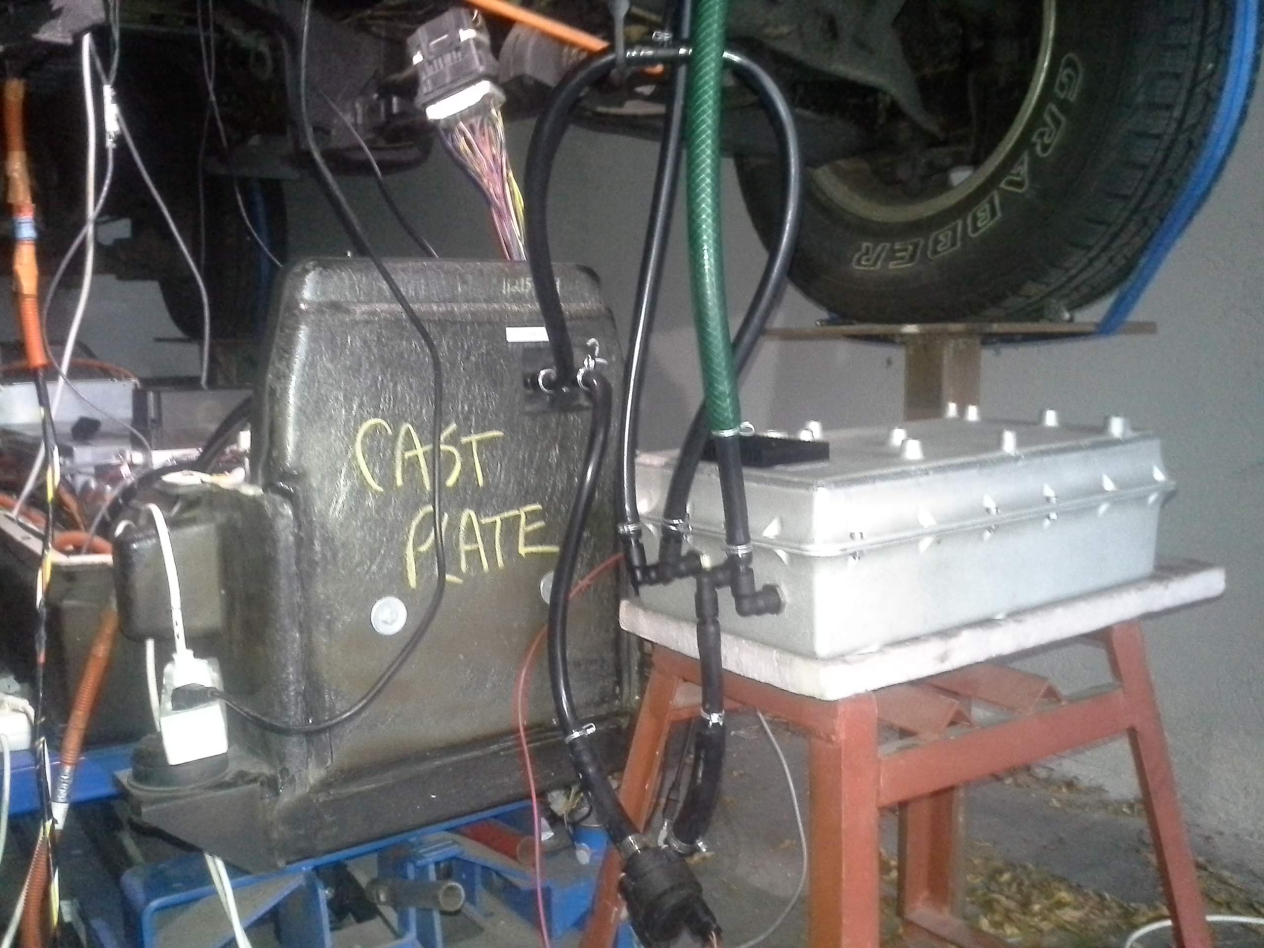There are two water loops, one for the battery and the other is using the original cooling loop for motor, inverter DC/DC and Tesla charger.