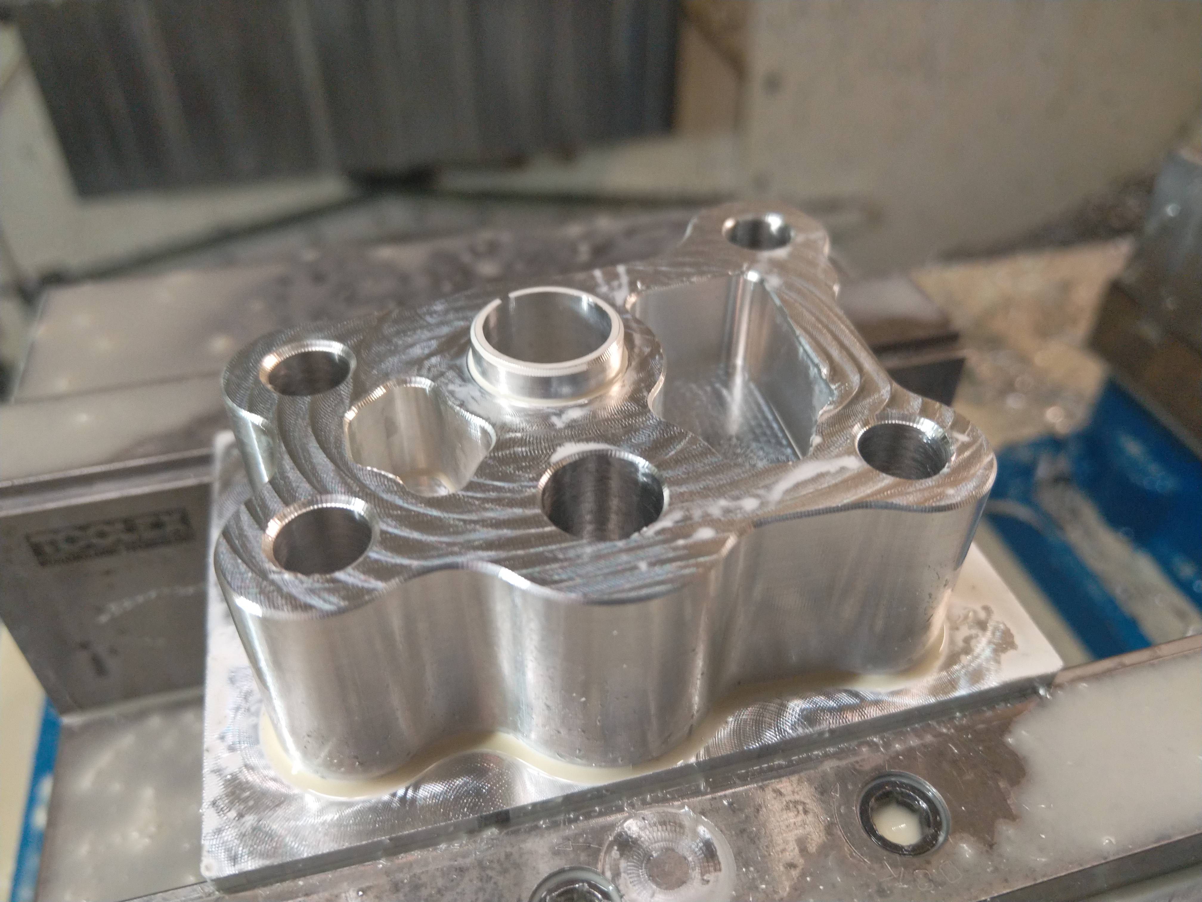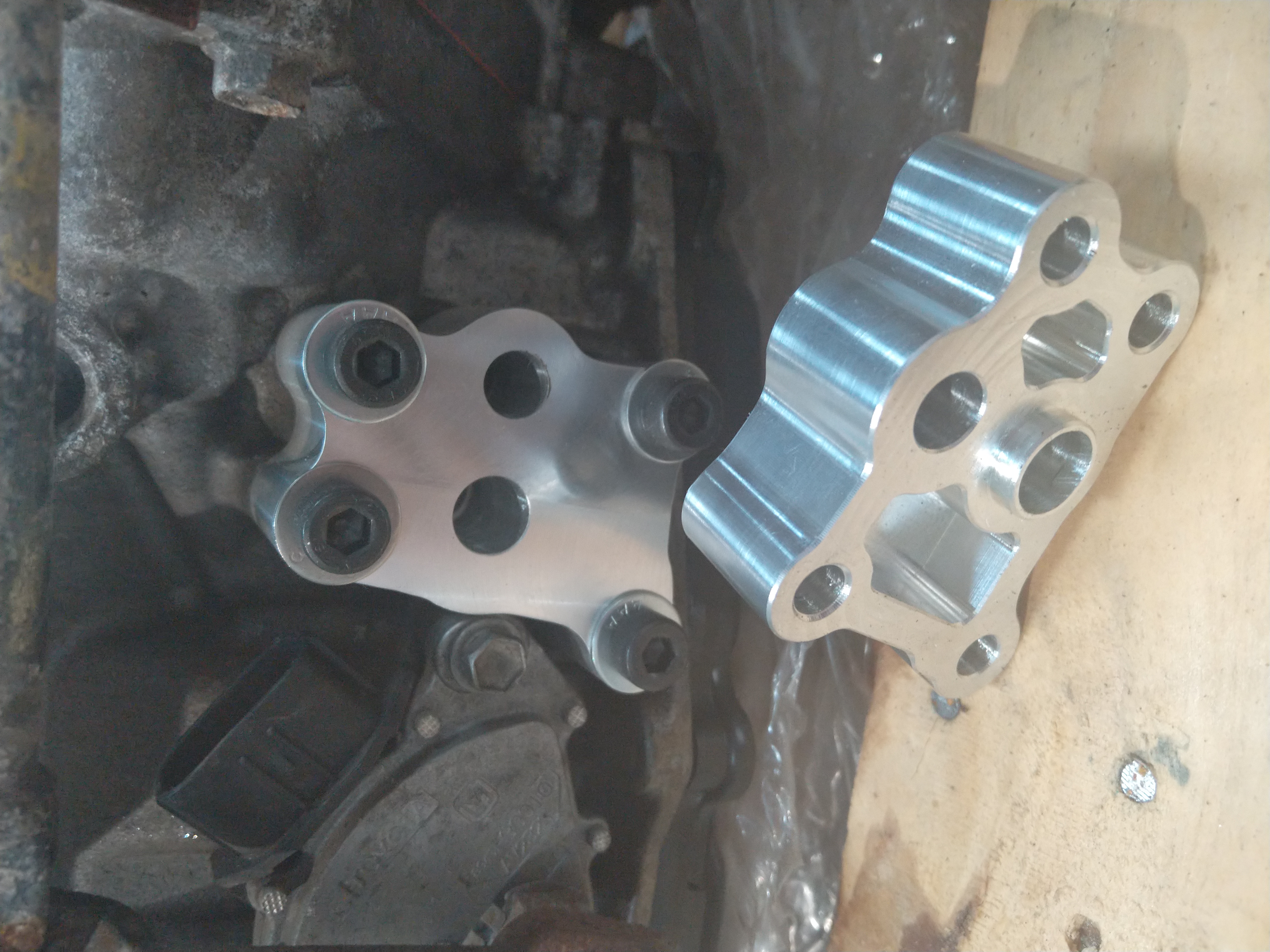 I recently acquired a transmission without a pump and figured it would be a good opportunity to machine an adapter plate for an alternate. My guess is that the left port is the pressure side and the smaller is the suction.