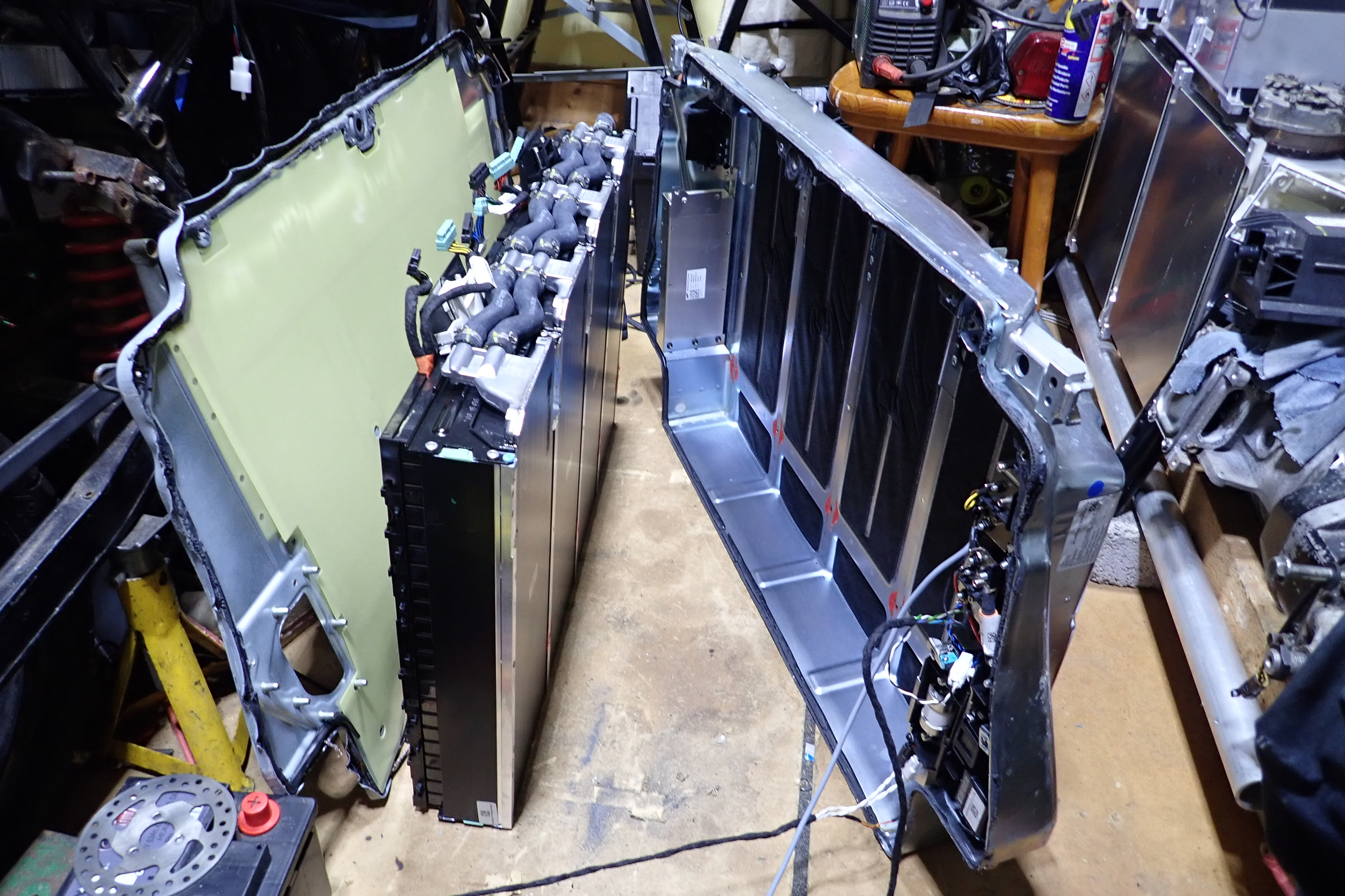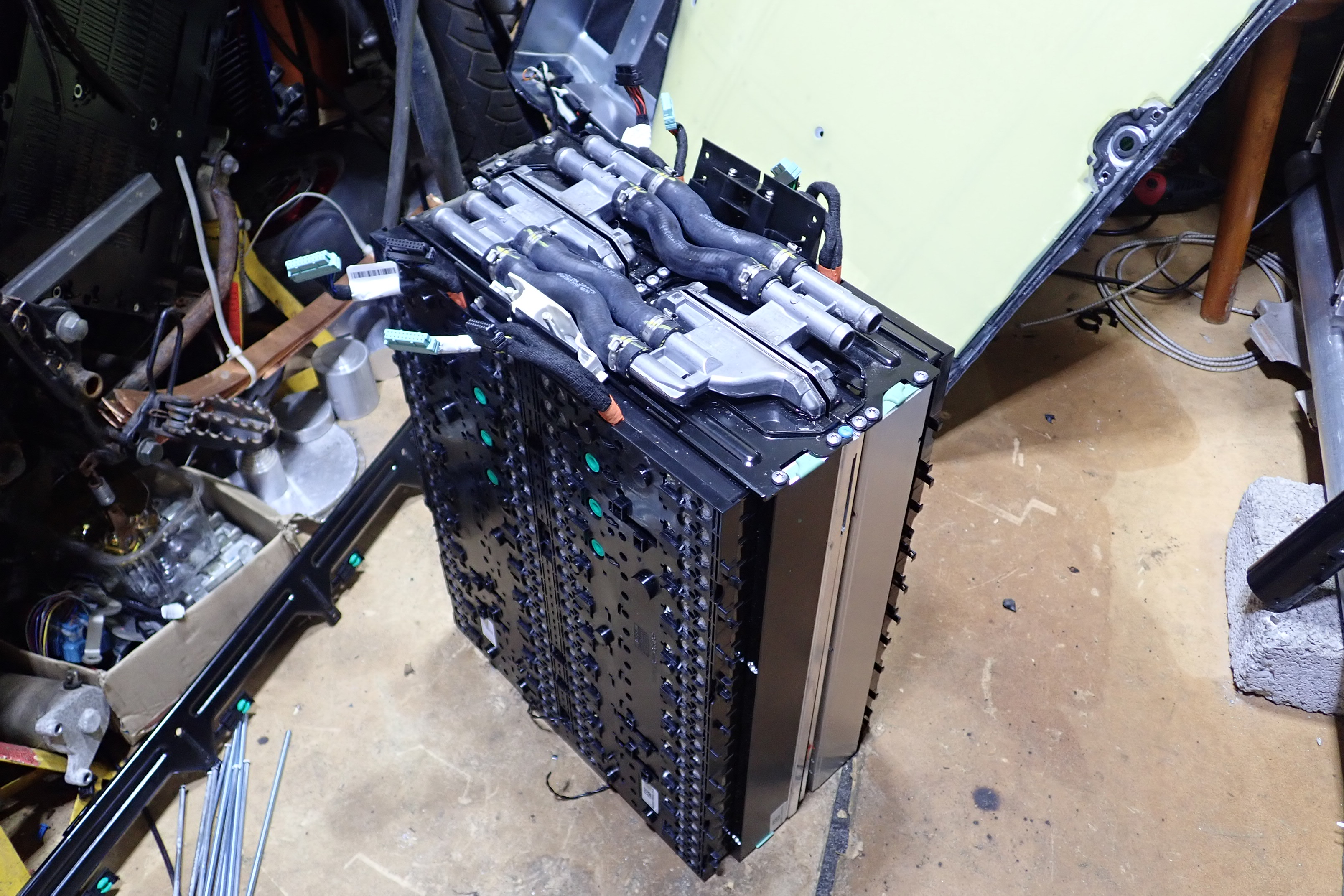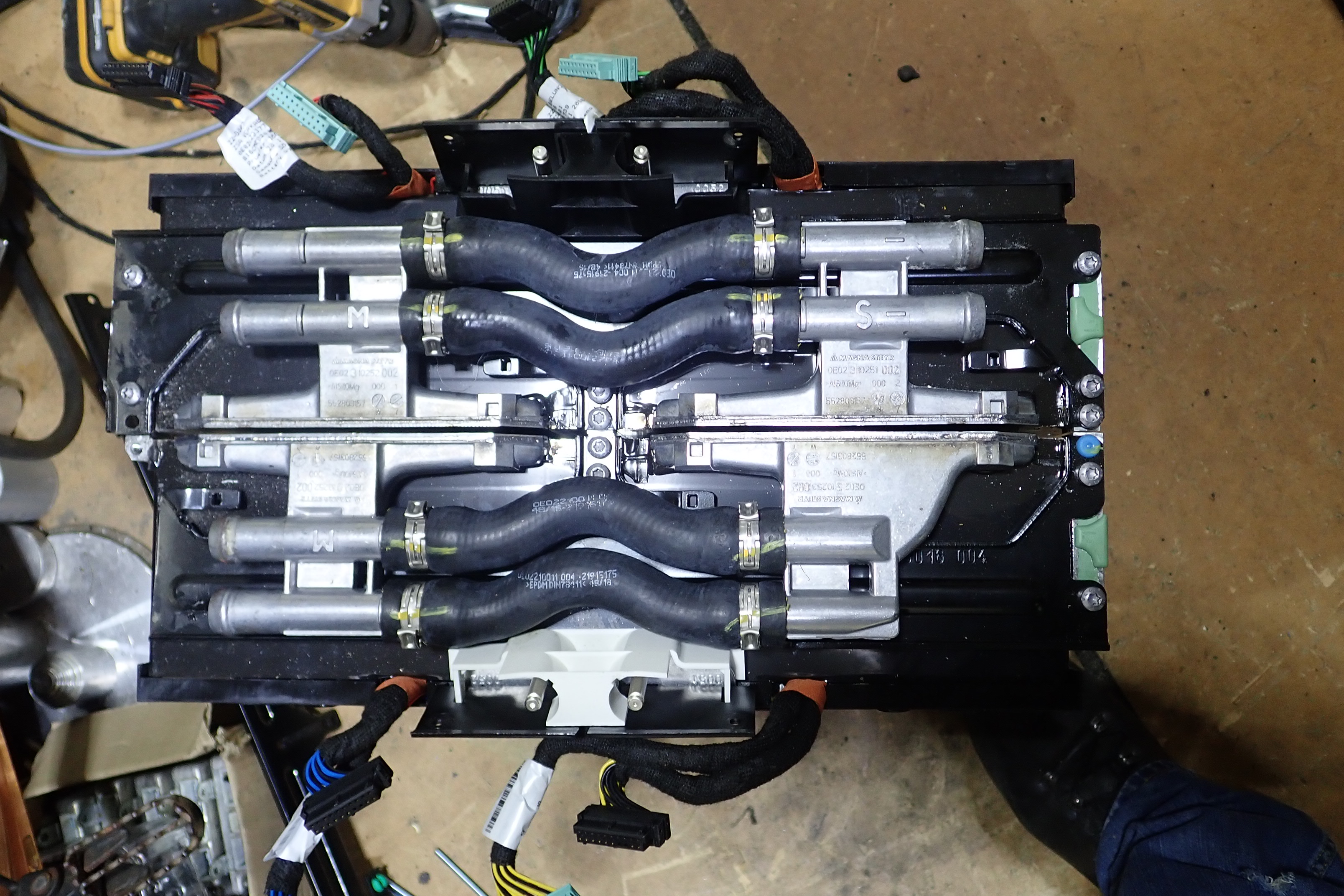 The cells are bonded to water jackets on the base in groups of 22s, These are joined in turn as 2 banks of 44s cells that can be separated without cutting the joining aluminum battery strap between the pair of 22s banks.