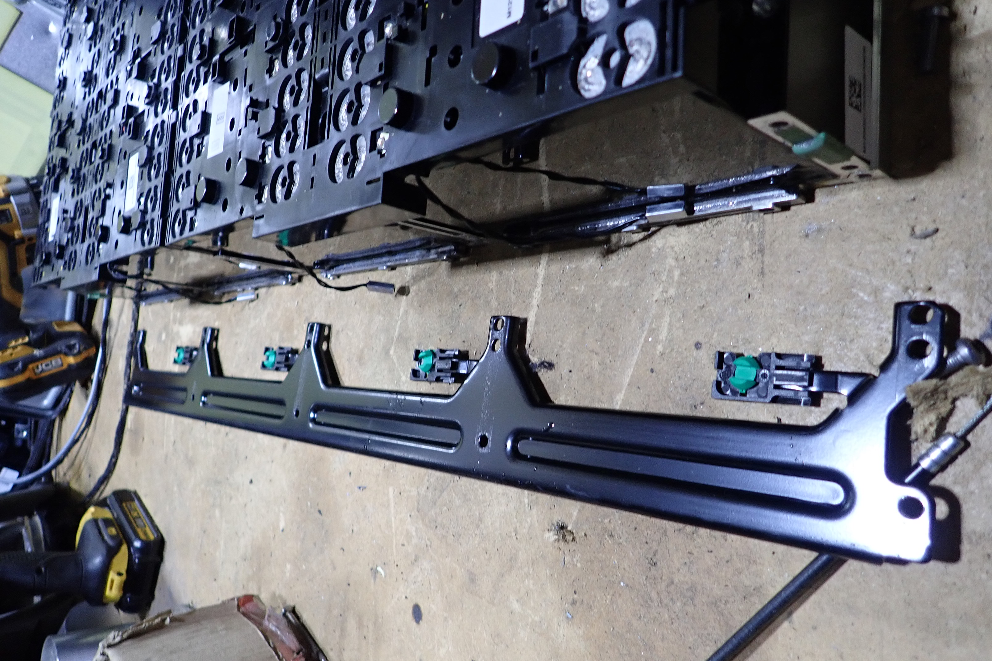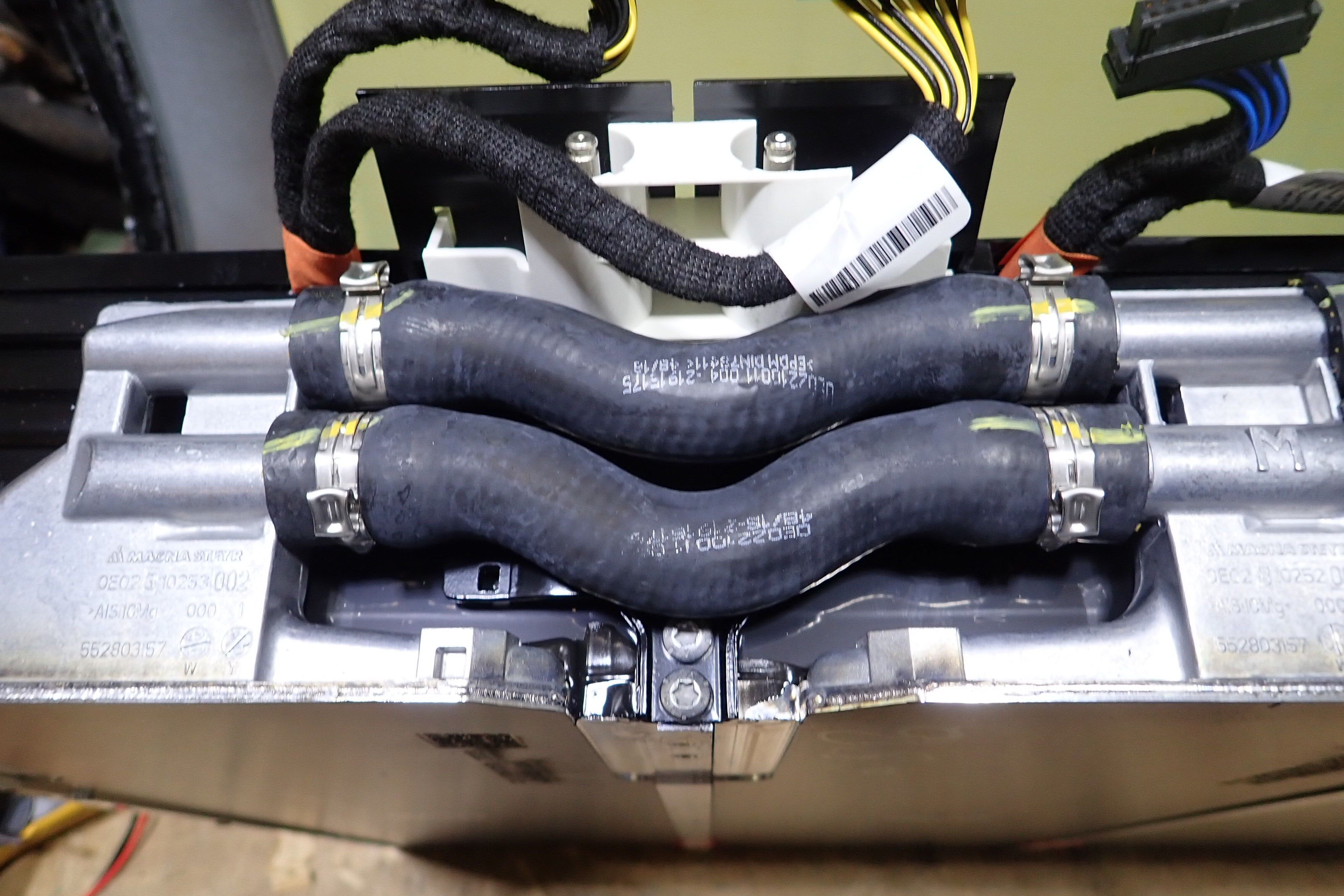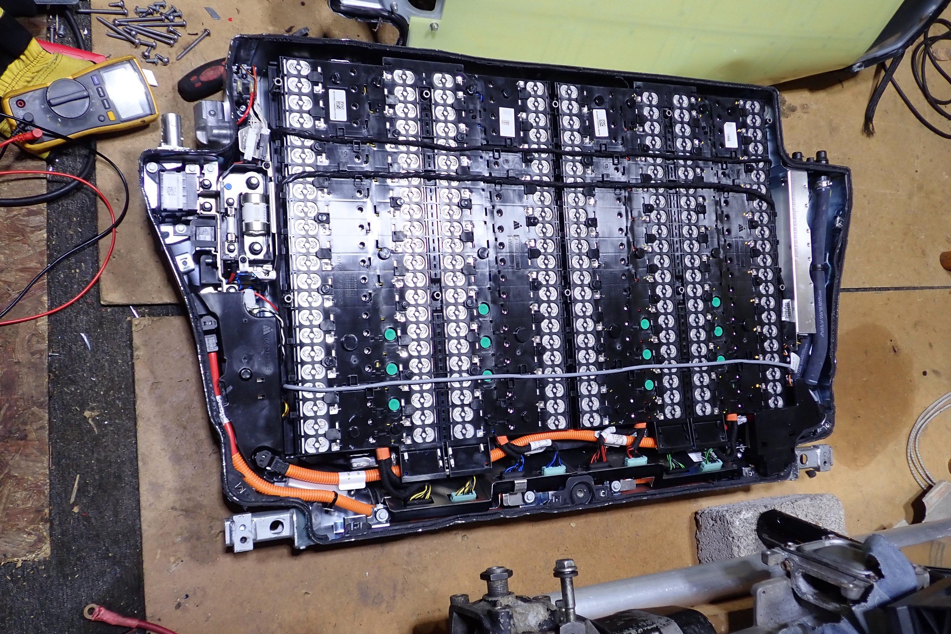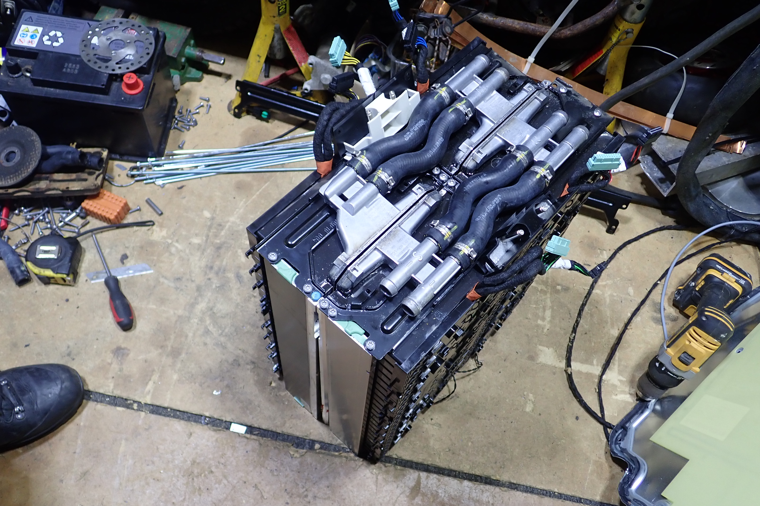 The cells are bonded to water jackets on the base in groups of 22s, These are joined in turn as 2 banks of 44s cells that can be separated without cutting the joining aluminum battery strap between the pair of 22s banks.